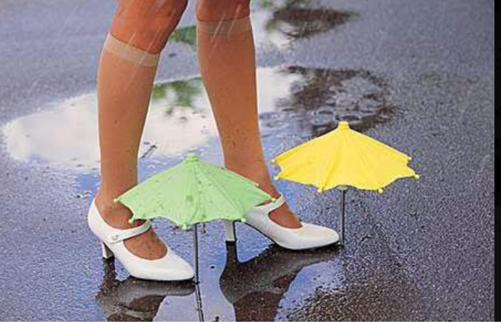 - Le scarpe con ombrellini annessi; di pessimo gusto, ma in effetti riparano i piedi in caso di pioggia. Complimenti ai coraggiosi che le indossano