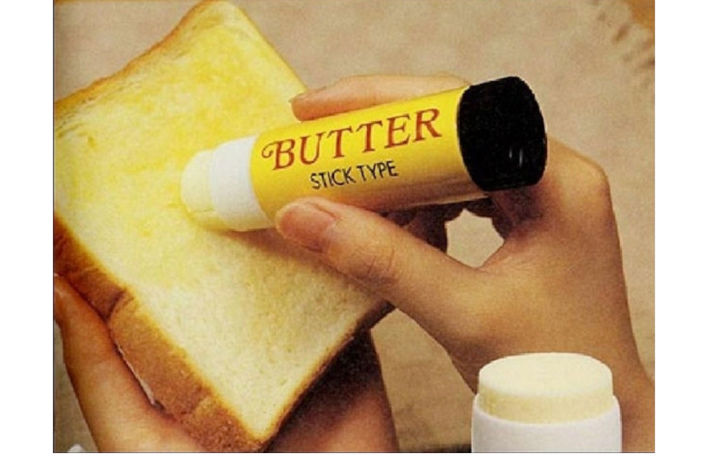 - Il burro stick: se siete annoiati dal difficile rito di spalmare il brutto sul pane, ecco che il butter stick vi viene incontro, e il burro sarà facile da spalmare come la colla al laboratorio di arte delle elementari.