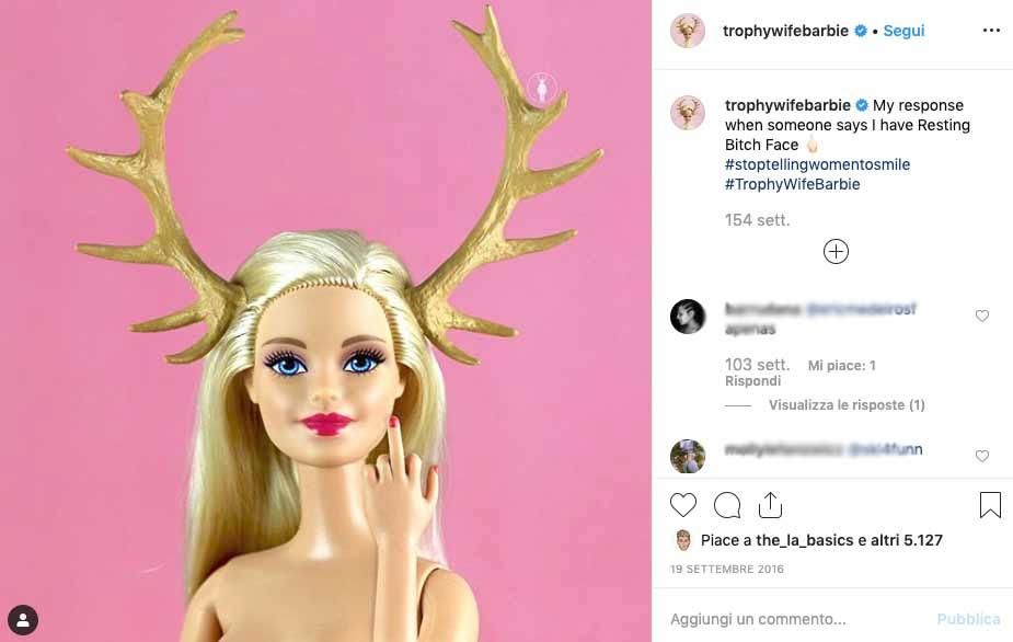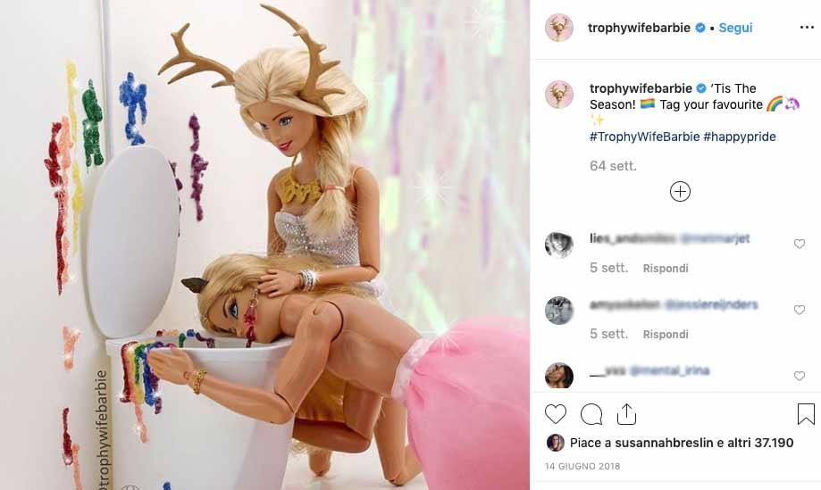 Moglie trofeo, questo il significato del suo nome: si tratta di una vera e propria provocazione che vuole porre l’accento sui pregiudizi che, purtroppo, ancora oggi accompagnano la donna e il suo ruolo nella società. Barbie non è una mogliettina attenta e premurosa, Barbie si arrabbia, fa tardi la notte, ama le donne e ha qualche chilo di troppo.