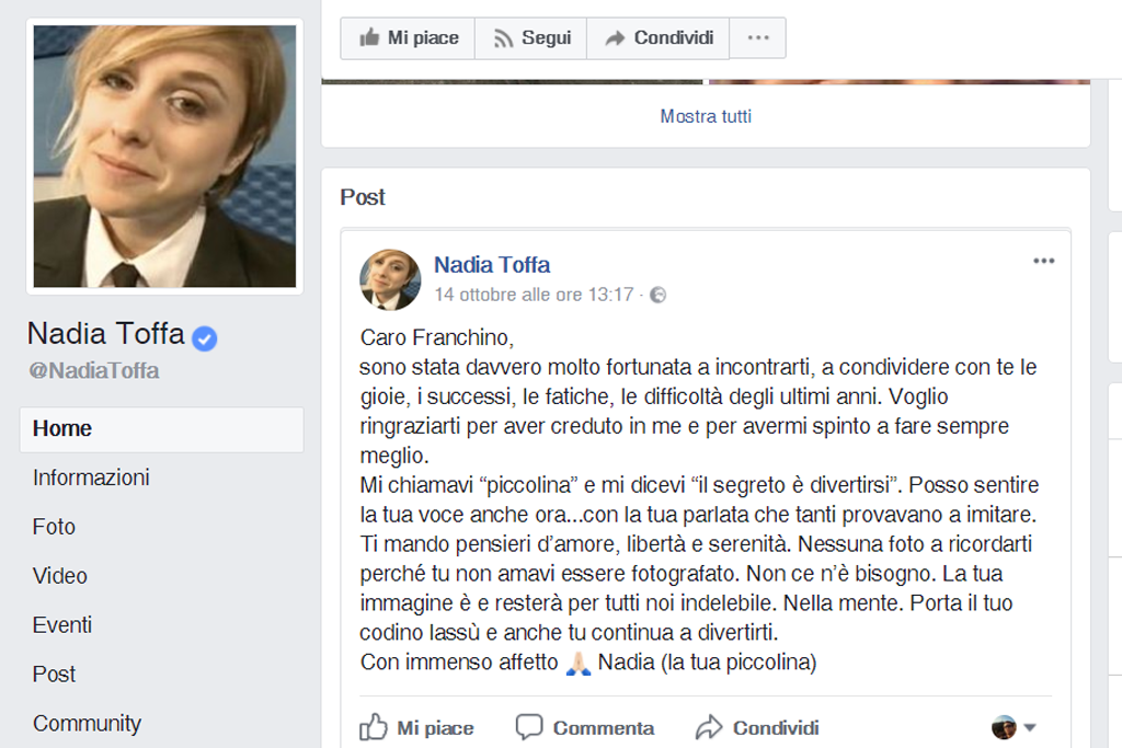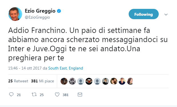 “Ciao Franchino” così numerosi vip che hanno avuto l’onore di lavorare con Franco Tuzio, che è venuto a mancare sabato mattina a Milano dopo una lunga malattia, lo salutano sui social.