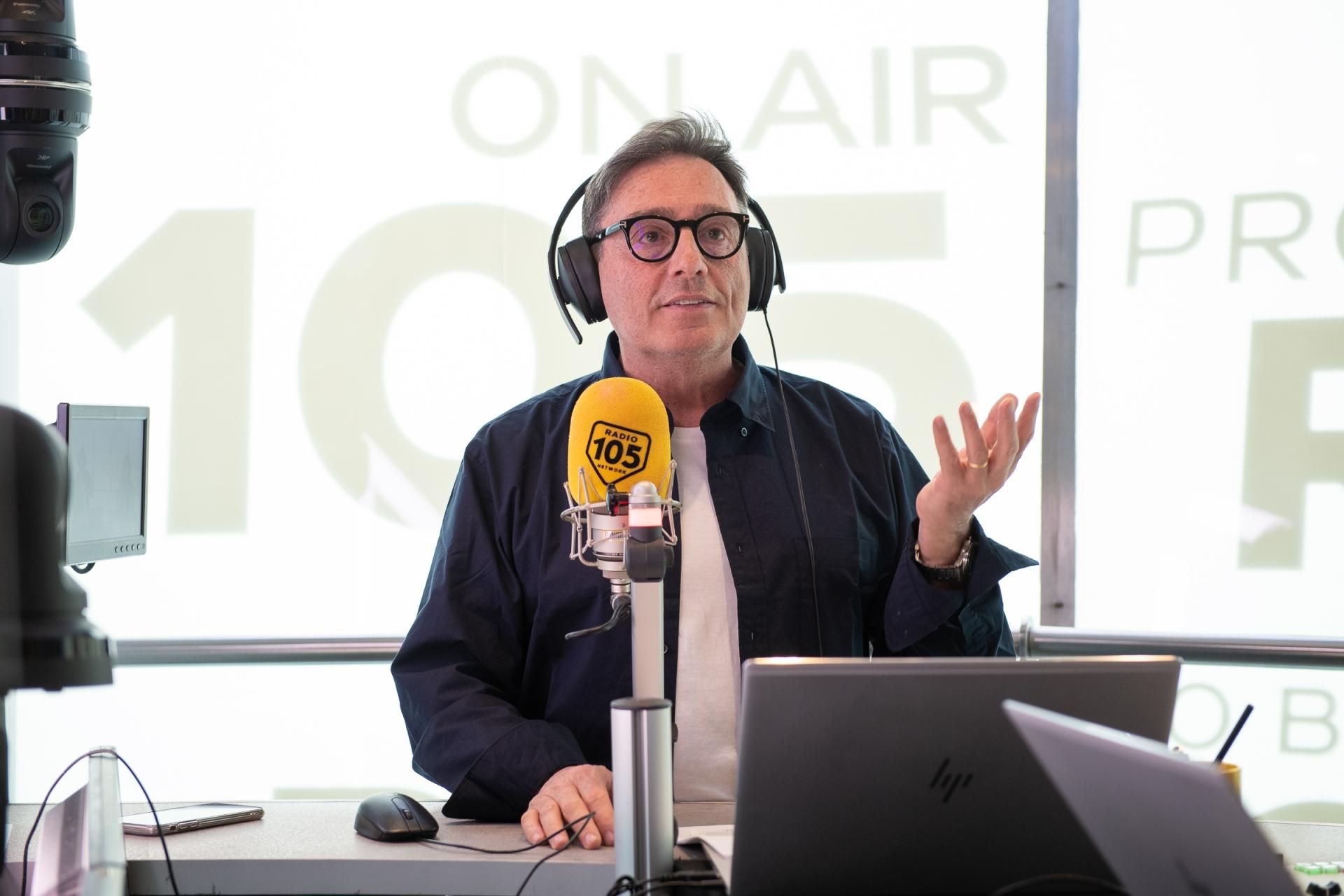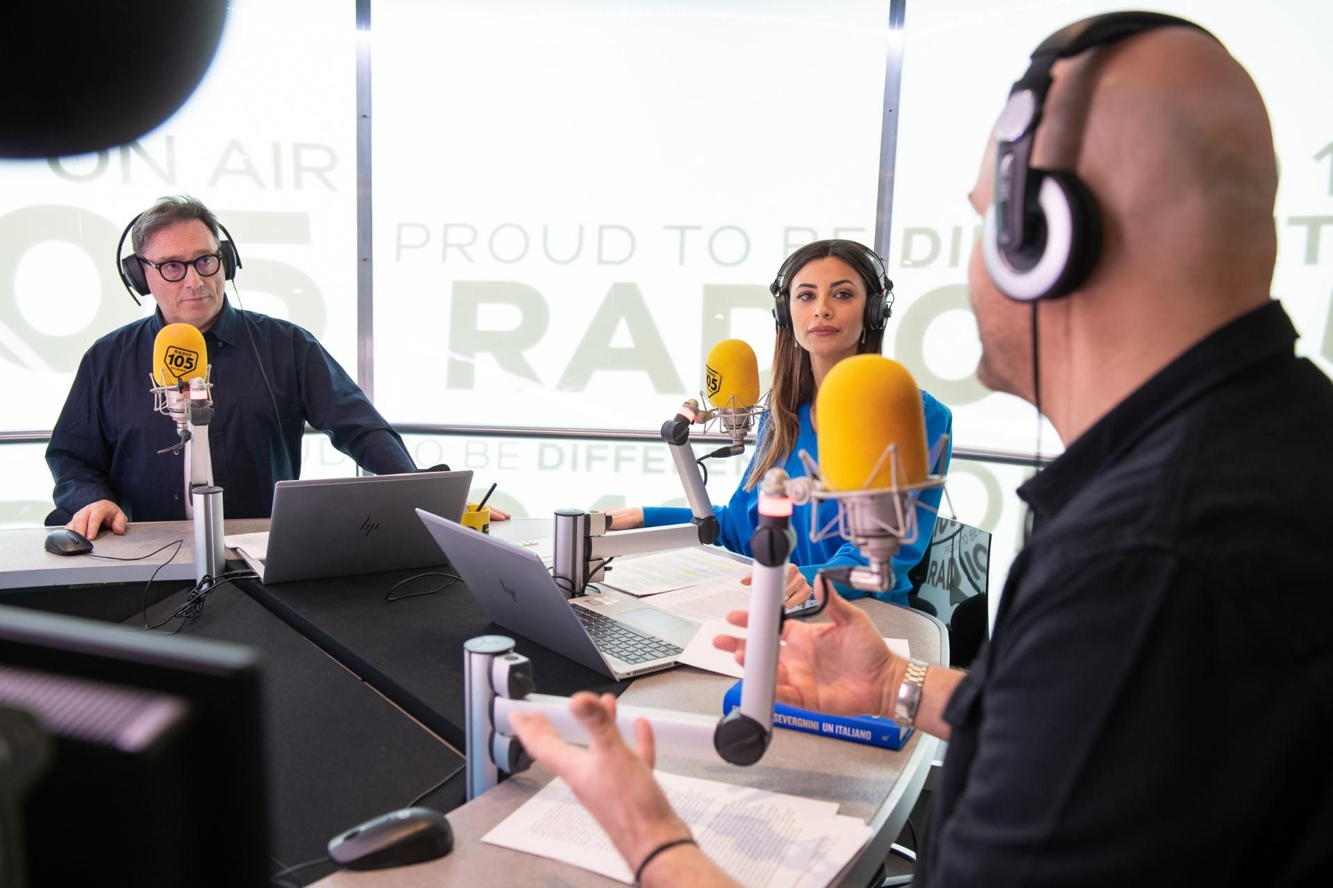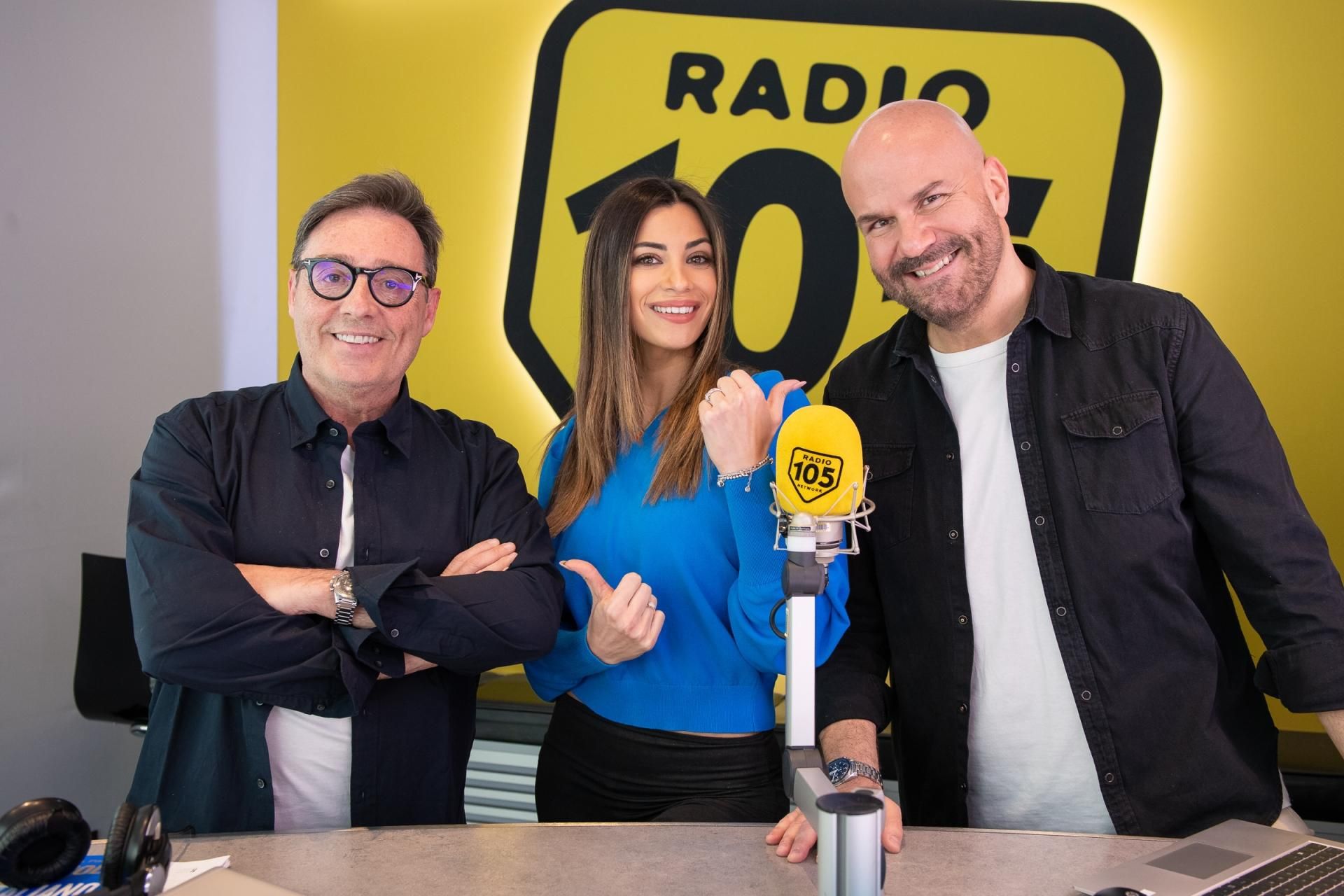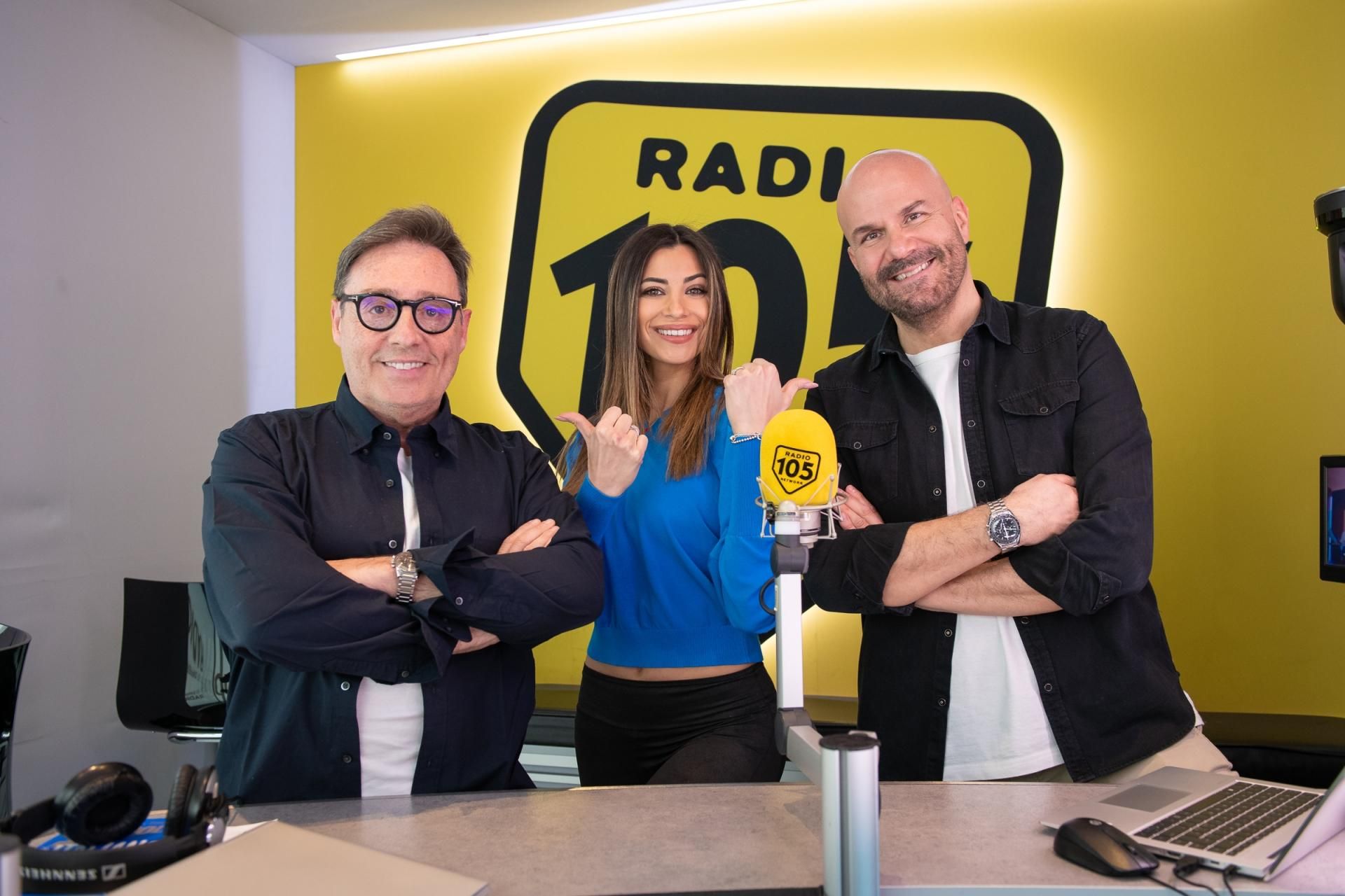 Da oggi la show girl condurrà insieme a Tony e Ross 105 Friends, ecco le foto della diretta TV prima puntata di 105 Friends con Romina!