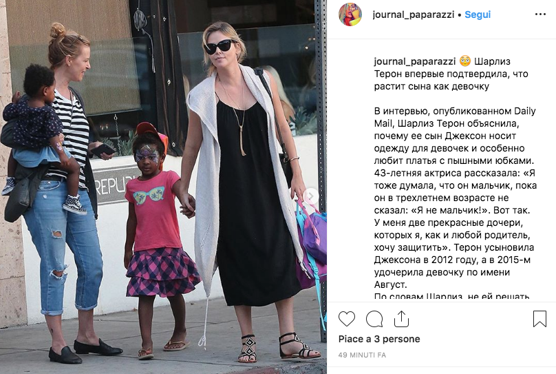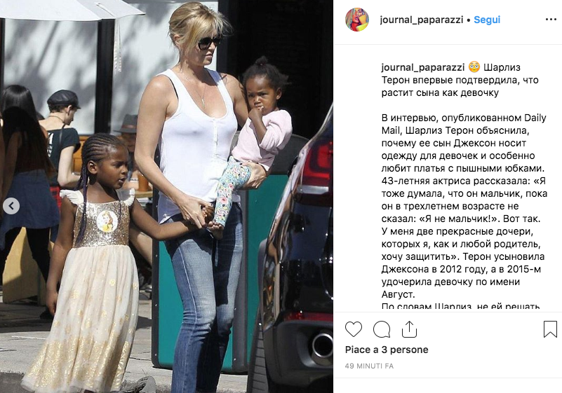 “Pensavo fosse un ragazzo fino a quando non mi ha guardato e mi ha detto: Io non sono un maschio. Aveva tre anni“, ha raccontato Charlize al Daily Mail.