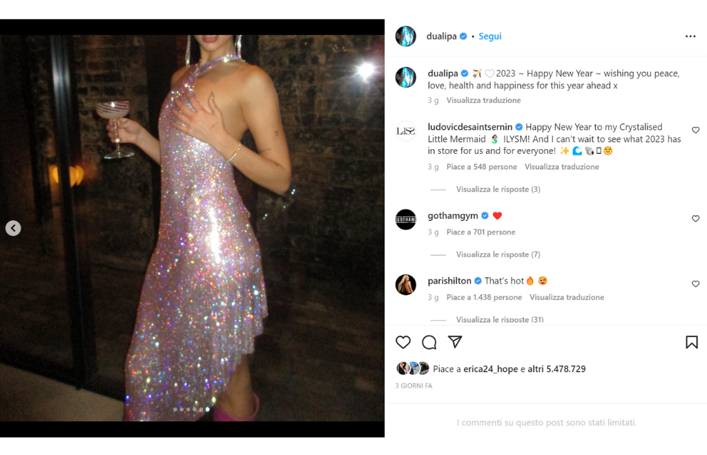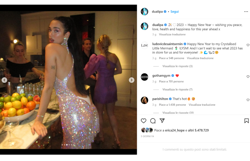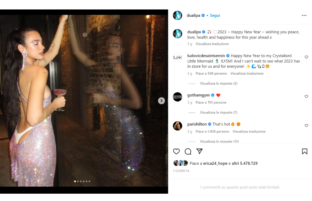 La cantante inglese Dua Lipa per Capodanno ha sfoggiato un abito scintillante che le lasciava l’intera schiena scoperta con tanto di perizoma in vista. Lo slip non era però rosso come da tradizione, ma bianco, la maggior parte delle persone, però, era interessata più ad altro che al colore. Il vestito di Dua Lipa era firmato dallo stilista parigino Ludovic de Saint Sernin, già apprezzato da star come Rihanna e Kim Kardashian.