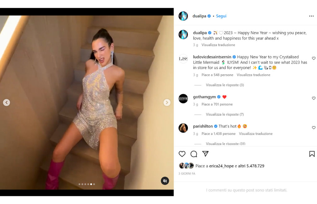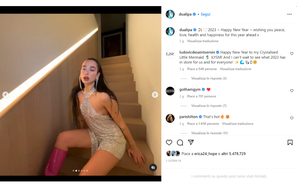 Dua Lipa, oltre che una cantante, è sicuramente un esempio di stile, tanto da essere definita un’icona glamour 2022. Per continuare il trend modaiolo anche nel 2023 ha inaugurato l’anno in bellezza completando il look con stivali aggressivi color magenta e orecchini pendenti a forma di stella. Super trendy anche la scelta di tenere l’intimo a vista, una moda degli anni 2000 che torna prepotentemente in voga ora. La cantante si dimentica però della scaramanzia scegliendo un tanga bianco e lasciando perdere il rosso per la notte di san Silvestro.
