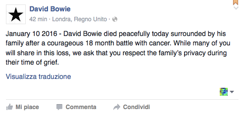 Questa mattina la famiglia di David Bowie ha annunciato (attraverso un post comparso sulla pagina ufficiale dell’artista) che il cantante è deceduto nella notte di domenica 10 gennaio dopo una lunga e coraggiosa battaglia contro una odiosa malattia. David Bowie lo scorso 8 gennaio aveva compiuto 69 anni e aveva pubblicato Blackstar, il suo ultimo album.