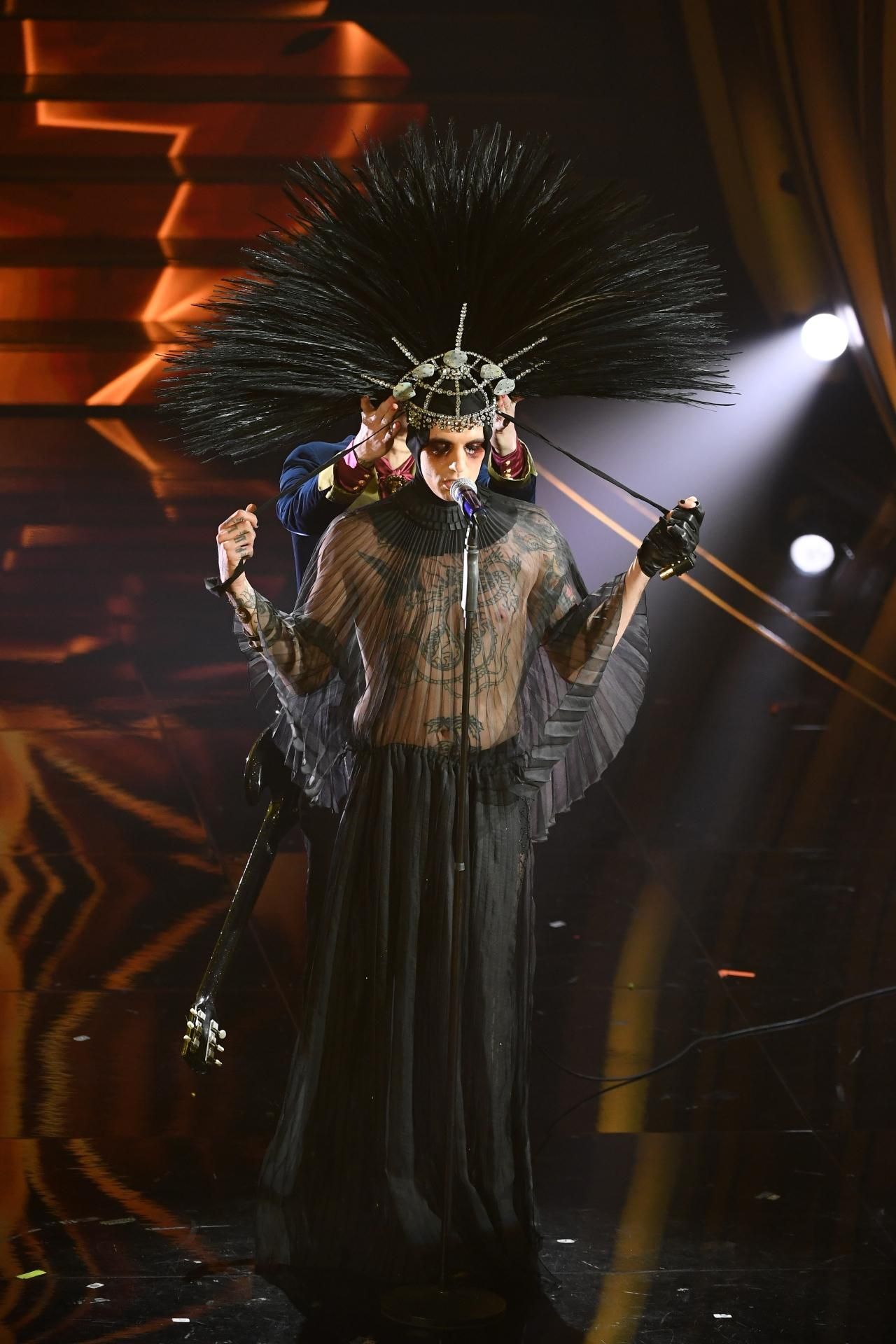 E i concorrenti? Ad esempio, Achille Lauro, questa volta, ha indossato un abito ispirato alla Marchesa Luisa Casati Stampa, con un velo nero trasparente e un copricapo piumato.