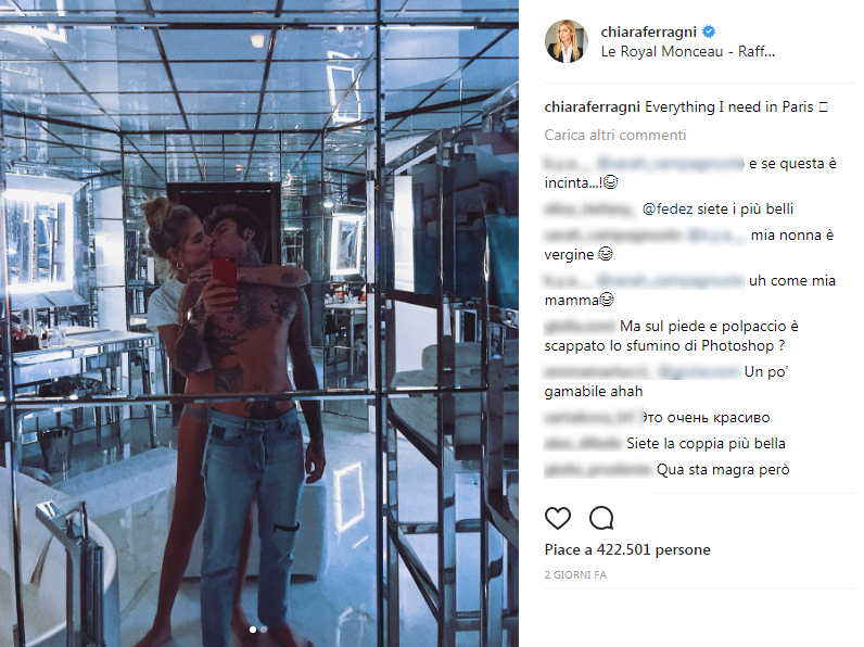 “Everything I need in Paris“, “Tutto quello di cui ho bisogno a Parigi“, questa la didascalia della foto postata da Chiara Ferragni su Instagram, con i due poco vestiti ma molto appassionati. Lo scatto per altro è stato postato dal Le Royal Monceau, lussuosissimo albergo a cinque stelle della capitale francese, nell’8° arrondissement di Parigi. La perfetta location romantica per un primo anniversario.