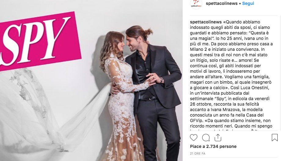 L’ex tronista di “Uomini e DonneLuca Onestini e la modella ceca Ivana Mrazova si amano. La loro relazione è iniziata nella Casa del Grande Fratello Vip 2 e ora, a 10 mesi di distanza, la loro unione è più forte che mai. In un’intervista al settimanale Spy, Luca si confida: “È l’amore della mia vita. Sono stato davvero fortunato e per questo ringrazio il Gf Vip“. La coppia ha posato per un servizio fotografico in abiti da matrimonio: “Se continua così, i vestiti indossati per motivi di lavoro, li indosseremo per andare all’altare“.
