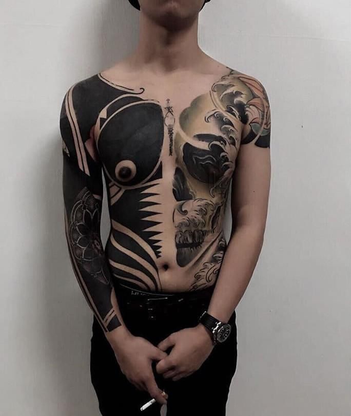 Si tratta, infatti, di farsi ricoprire intere e vaste aree del corpo di inchiostro nero, che verrà sfumato solo in alcuni punti per formare delle rappresentazioni per lo più geometriche, ma anche floreali, fino a raffigurare soggetti più classici come teschi e ancore.