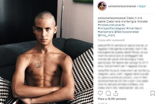 Credo in mio padre! Credo nella mia famiglia ritrovata!“: sono queste le parole che che Carlos Maria Corona ha scelto di postare su Instagram, insieme con una foto che lo mostra a petto nudo, muscoli tesi, espressione seriosa. Sul petto una scritta: “Dad I love U“. In poche ore il profilo ha conquistato 91.100 follower. Ma la prima a criticare la scelta è proprio sua madre Nina Moric. Curiosi di saperne di più? Sfogliate la nostra gallery.