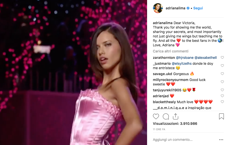 Adriana ha ringraziato Victoria’s Secrets su Instagram con un video che ripercorre le sue apparizioni in passerella e scrivendo: “Grazie per avermi mostrato il mondo, aver condiviso i vostri segreti, ma soprattutto non avermi dato solo le ali ma insegnato anche a volare. Mando il mio affetto a tutti i fan nel mondo. Con amore, Adriana”.
