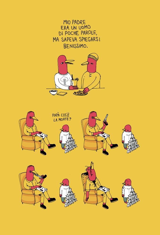 Protagonista dei suoi lavori un pennuto giallo e rosso, che l’illustratore utilizza per portare allo scoperto, sempre con grande ironia, tutte quelle situazioni imbarazzanti o spiacevoli che capitano a ognuno di noi.