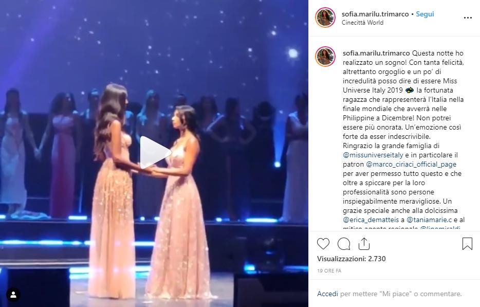 La finale di Miss Universe Italy 2019 è stata disputata domenica scorsa a Roma presso il Teatro 1 di Cinecittà World. Nella serata, condotta dalla giovane e spigliata Rebecca Staffelli (figlia di Valerio, inviato di Striscia la Notizia), si è aggiudicata il titolo la bellissima Sofia Marilù Trimarco.