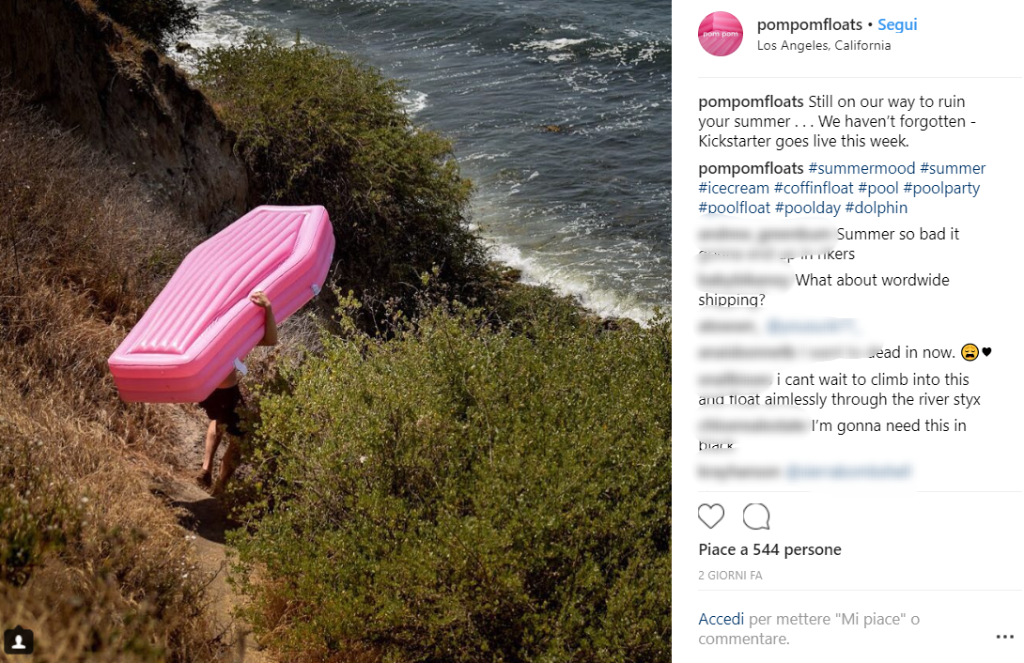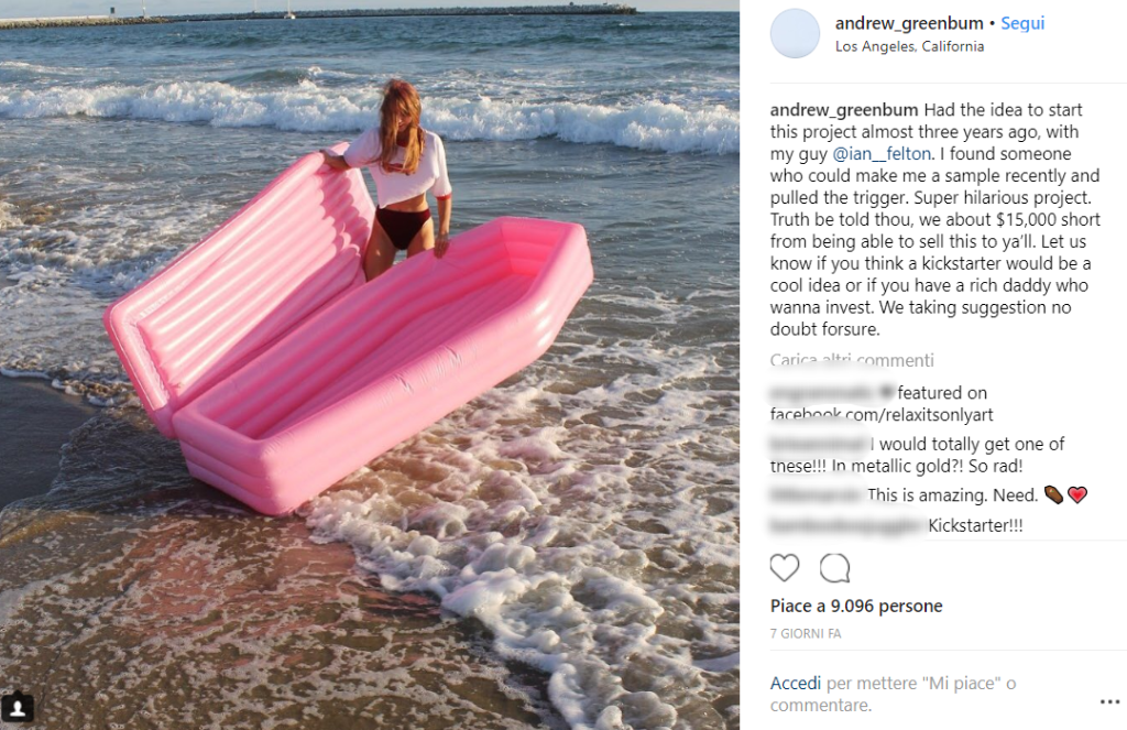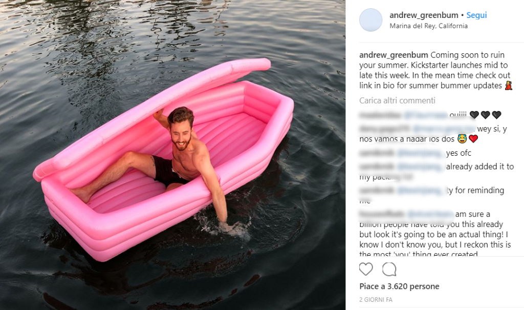Suvvia, non siate superstiziosi. Qui la morte non c’entra nulla, anzi. Un giovane designer canadese, Andrew Greenbaum, ha creato il prototipo di questo materassino rosa a forma di… bara! E su Instagram sta spopolando. Certo, per ora è solo un prototipo e per la realizzazione servono parecchi soldi. Se tuttavia, l’idea di galleggiare sul mare su un gonfiabile quanto meno insolito vi intriga, sapete a chi donare i vostri risparmi.