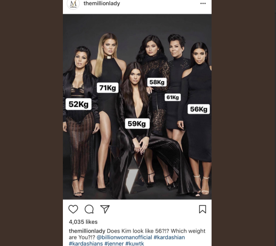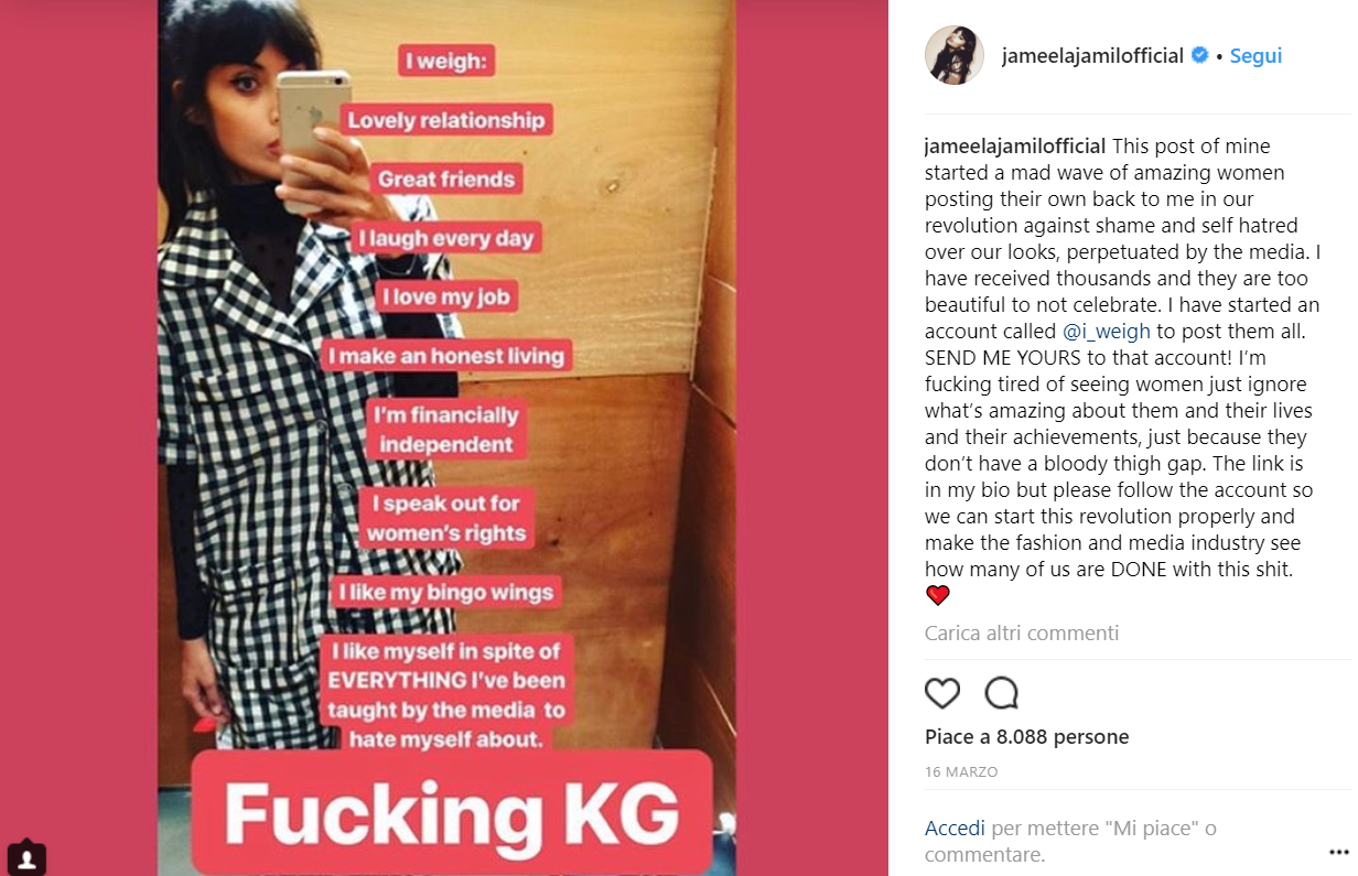 Jameela Jamil, attrice di The Good Place, ha lanciato questo hashtag e poi ha creato un account Instagram apposta. Il tutto è nato per reagire a una foto postata dalle donne Kardashian che si sono fotografate dichiarando il proprio peso (in chili) e invitando le follower a scrivere il proprio peso.