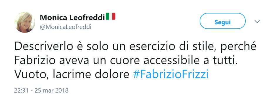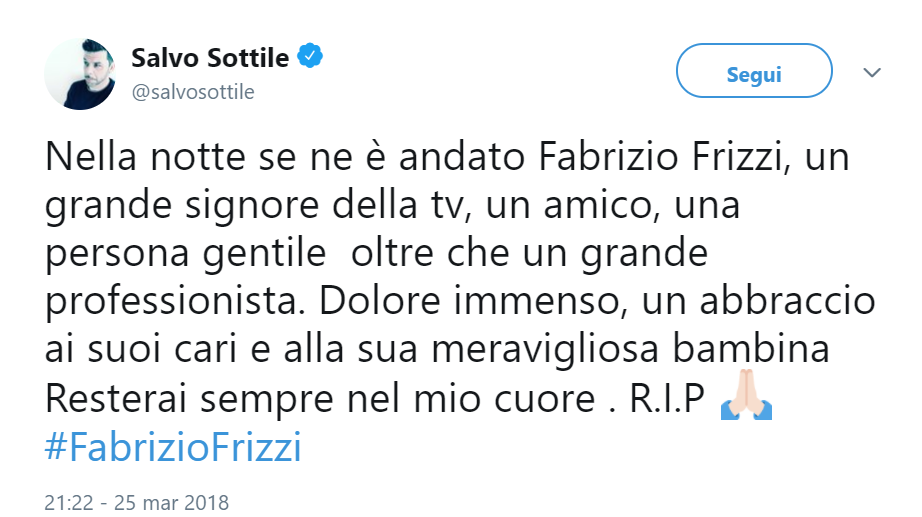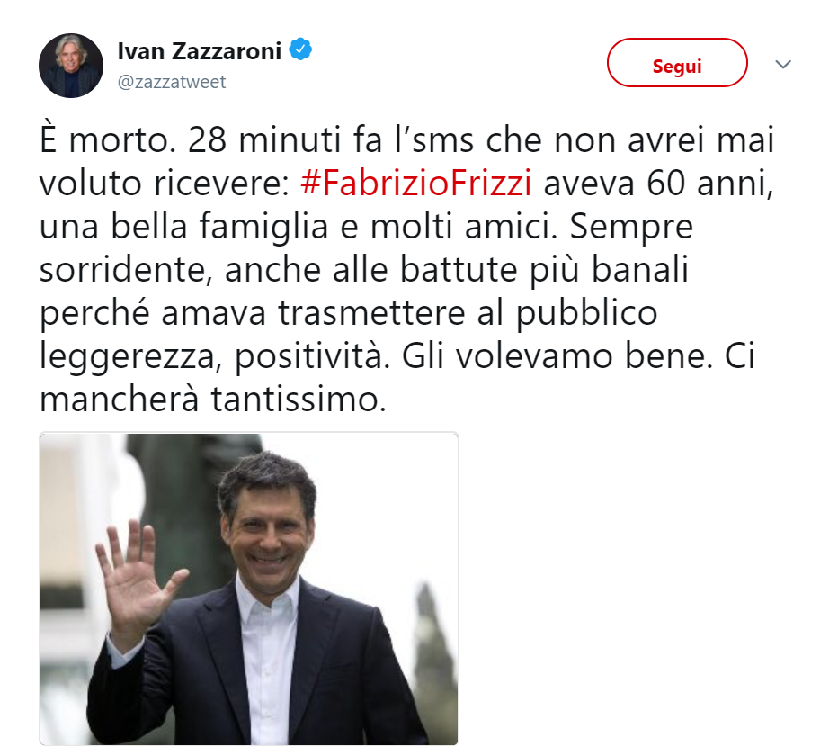 Era un uomo molto amato e sui social sono numerosi gli amici del mondo dello spettacolo (e non solo) che hanno voluto dedicargli un pensiero. Da Antonella Clerici a Pippo Baudo in molti hanno desiderato salutare ancora una volta Fabrizio.