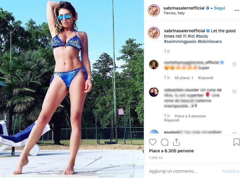 Gli scatti fanno parte di una campagna pubblicitaria per un brand di costumi da mare. Ed ecco che Sabrina sfoggia un seno prosperoso, due gambe chilometriche e curve pazzesche. Il tutto è impreziosito dalle pailettes e dai lustrini applicati sui bikini coloratissimi.