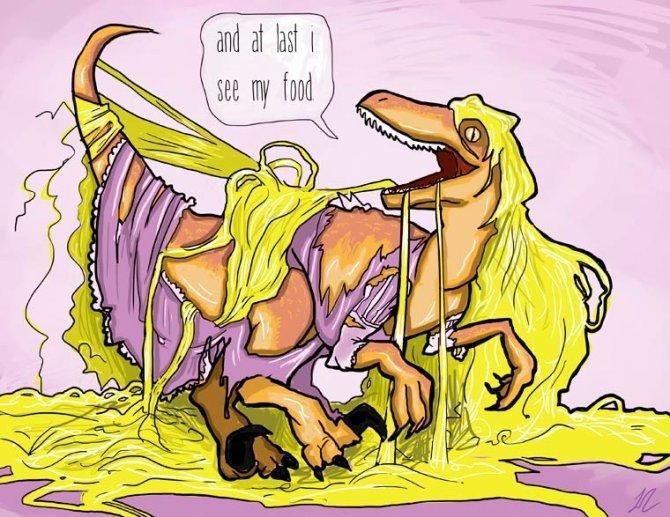 È quest’ultimo il caso delle creazioni realizzate dall’illustratrice Laura Cooper, che ha creato un assoluto non-sense sull’onda del successo dell’ultimo sequel di Jurassic Park: Jurassic World.