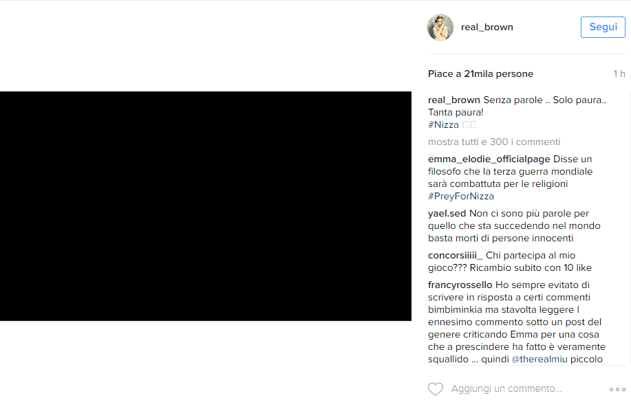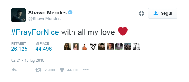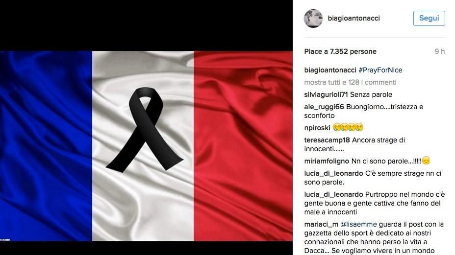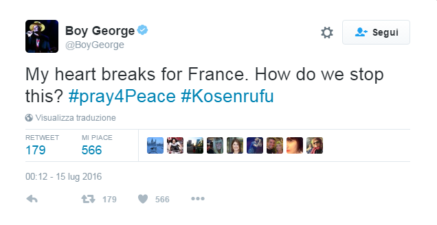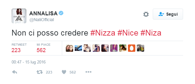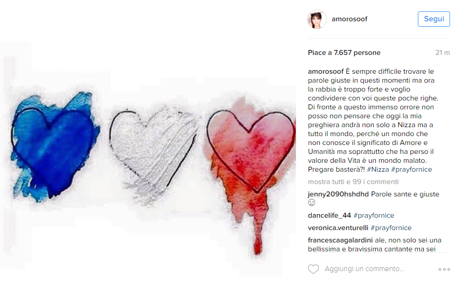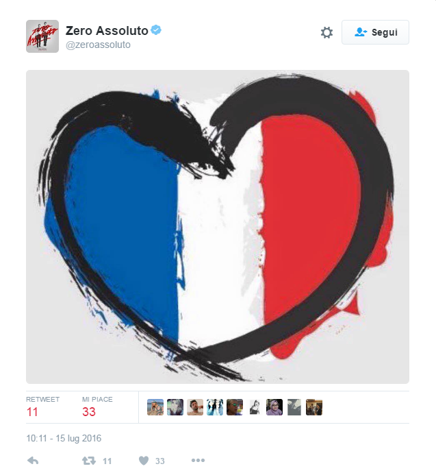 “Ho il mal di mondo, mi sento a pezzi. Senza parole e senza più aria”, il commento su Facebook di Giuliano Sangiorgi, che solo qualche giorno fa si era fatto portavoce della tristezza dopo lo scontro tra treni avvenuto nella sua Puglia. Ma sono tanti gli artisti che preferiscono affidare il proprio pensiero a un’immagine come Biagio Antonacci, Emma Marrone, Alessandra Amoroso e gli Zero Assoluto. Marco Mengoni ha deciso di annullare il suo concerto previsto per la serata di venerdì 15 a Saint-Tropez per rispettare il lutto nazionale francese, comunicandolo ai fan tramiti i suoi profili social.