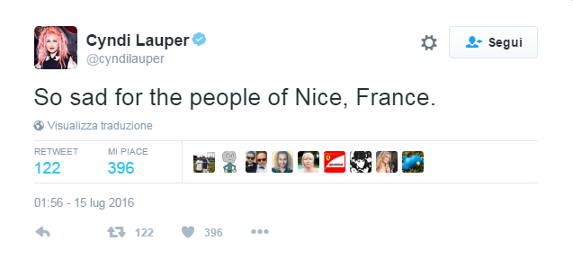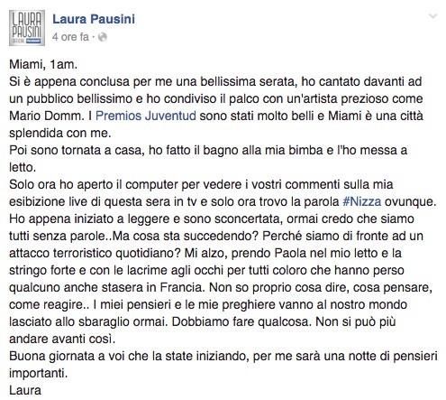 Dall’Italia. Ma anche gli artisti italiani hanno voluto esprimere il loro cordoglio per quanto successo a Nizza. Da Miami, subito dopo la fine del concerto Laura Pausini ha scritto: “Ho appena iniziato a leggere e sono sconcertata, ormai credo che siamo tutti senza parole. Ma cosa sta succedendo? Perché siamo di fronte ad un attentato terroristico quotidiano? Mi alzo, prendo Paola nel mio letto e la stringo forte e con le lacrime agli occhi per tutti coloro che hanno perso qualcuno anche stasera in Francia. Non so proprio cosa dire e cosa pensare. I miei pensieri e le mie preghiere vanno al nostro mondo lasciato allo sbaraglio ormai. Dobbiamo fare qualcosa. Non si può più andare avanti così”.