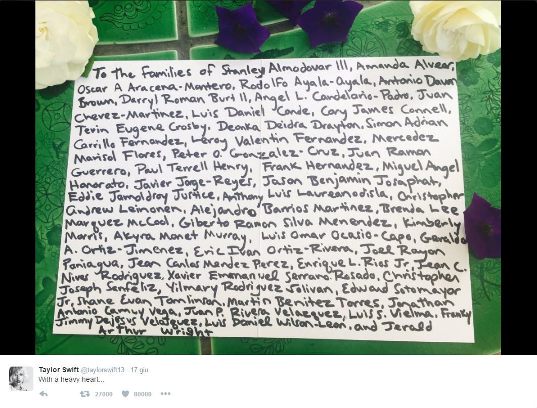 Rihanna ha immediatamente cancellato il concerto in programma a Nizza proprio stasera. E sono tanti i cantanti che hanno voluto esprimere la loro solidarietà alle vittime a cominciare da Taylor Swift: “A tutti quelli che questa settimana dovranno seppellire una persona amata, voglio far sapere che ci sono milioni di persone che vi mandano il loro amore di fronte a questa devastante ed impensabile tragedia”. L’unica risposta di fronte ad una tragedia come quella di Nizza è la preghiera e l’amore come sottolinea Madonna: “Preghiamo per la pace in Africa, in Francia e dovunque nel mondo”. “Sto pregando per la Francia. quando aprite gli occhi e vede il caos, chiudeteli e vedrete l’armonia. Siamo con voi”, ha scritto su Twitter Lady Gaga.