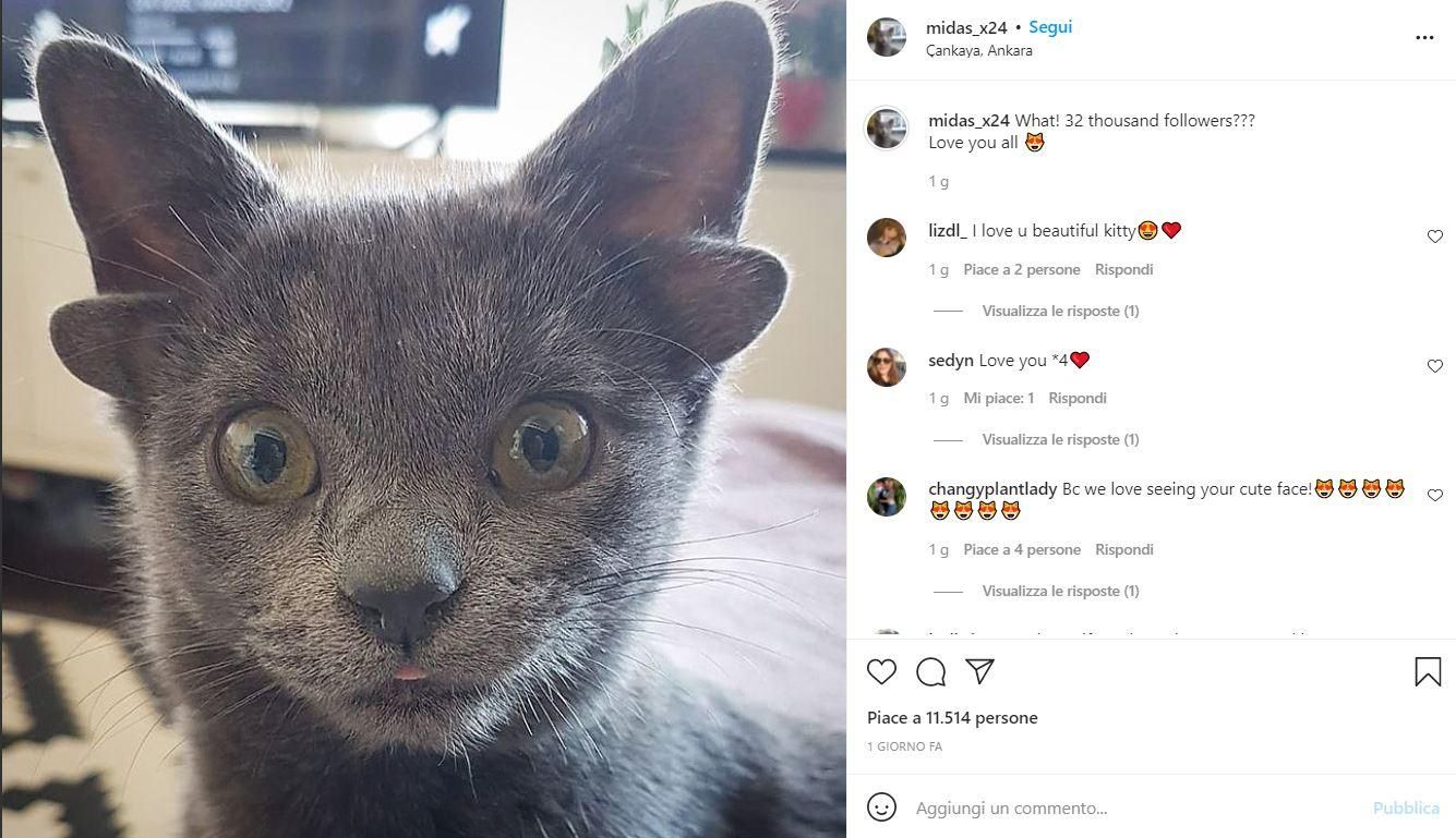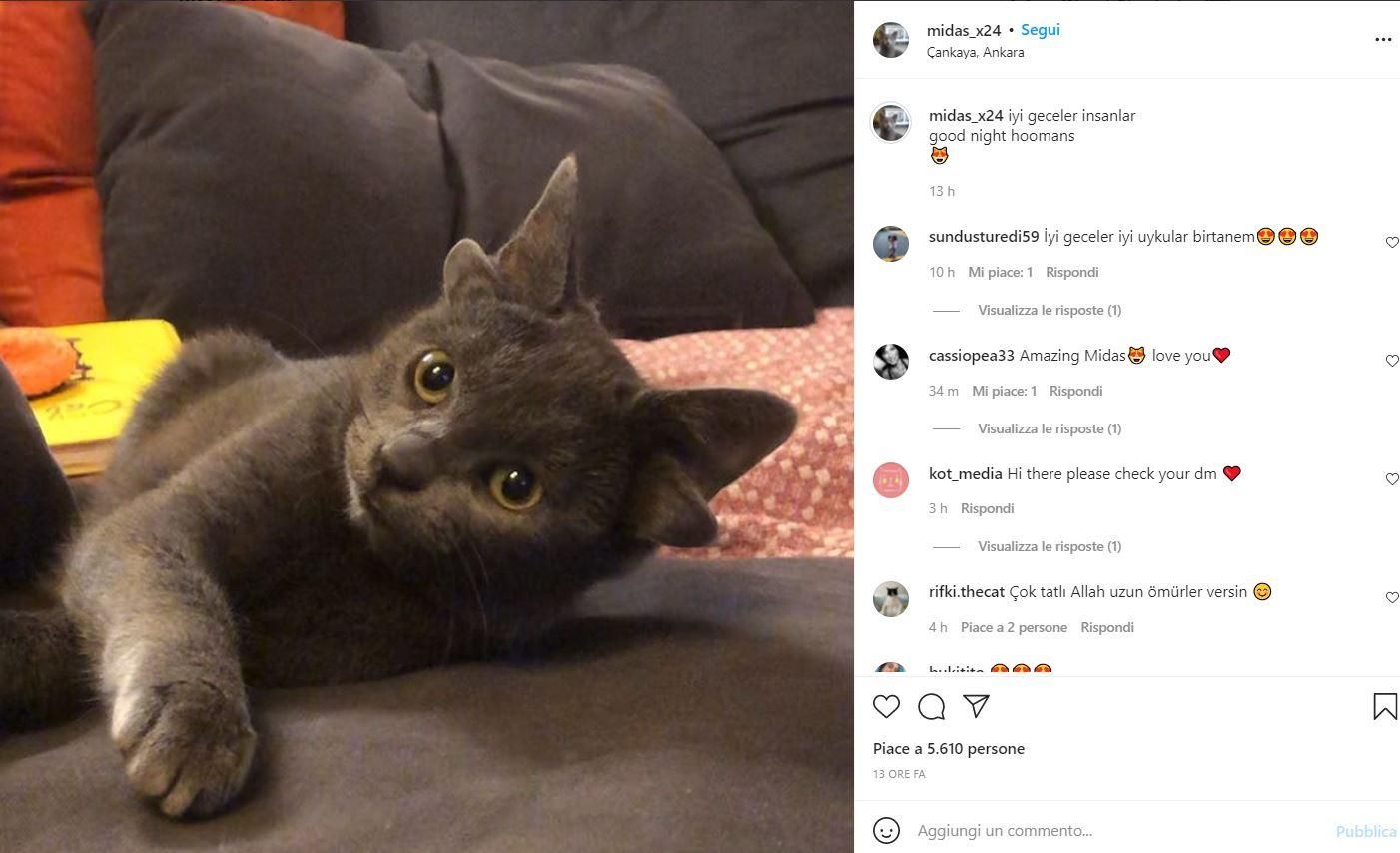 La storia della gatta Midas è una tenera avventura a lieto fine. Midas è una gatta nata con una malformazione: ha 4 orecchie, ma questa cosa non le consente di sentire meglio, ma normlamente. Si tratta quindi solo di un difetto fisico dovuto a una mutazione genetica che ha ereditato dai suoi genitori. Questa cosa l’ha resa molto famosa sui social, ma ha anche reso complicato la sua adozione, per la sua diversità. Midas arriva dalla Turchia ed è stata adottata da una donna che ha subito apprezzato il suo aspetto singolare: oltre alle due orecchie “di troppo” ha anche una macchia bianca a forma di cuore sul ventre che la rende davvero speciale. La donna che l’ha adottata è un’amante degli animali e ha due Golden Retriever di nome Suzy e Zenyo. La donna ha aperto un account Instagram in cui racconta le coccole e giochi degli animali che popolano la casa; la vera star è Midas e grazie a lei l’account ha raggiunto oltre 45 mila follower. Sfoglia la gallery per vedere quanto è carina Midas con le sue quattro orecchie!