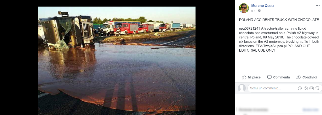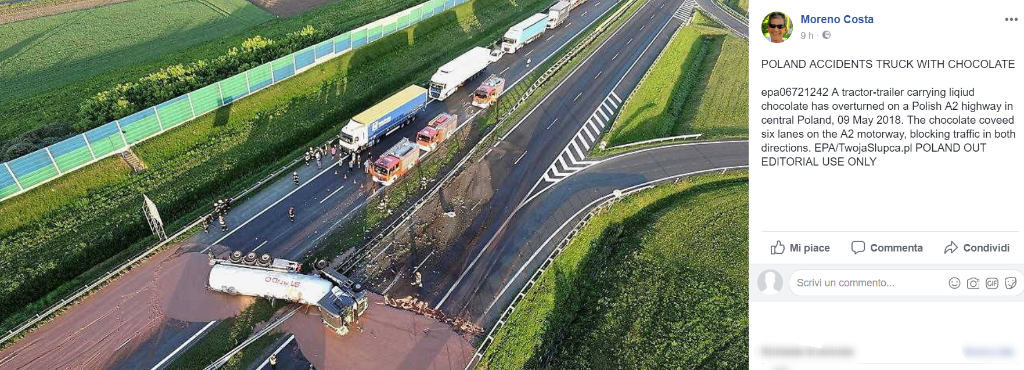 Un’autostrada in Polonia è stata bloccata in entrambe le carreggiate. La ragione? Un incidente? Sì, un Tir si è in effetti ribaltato. Non è per questo però che la strada è stata chiusa. Il traffico è stato bloccato a causa di una ragione molto più “dolce”. Il Tir trasportava infatti cioccolata che, a seguito dell’incidente, si è riversata a valanga sulle due carreggiate.