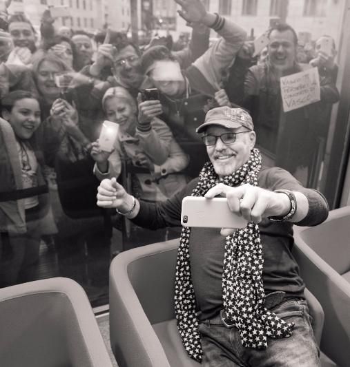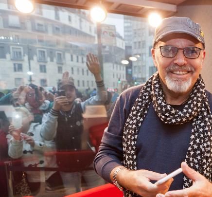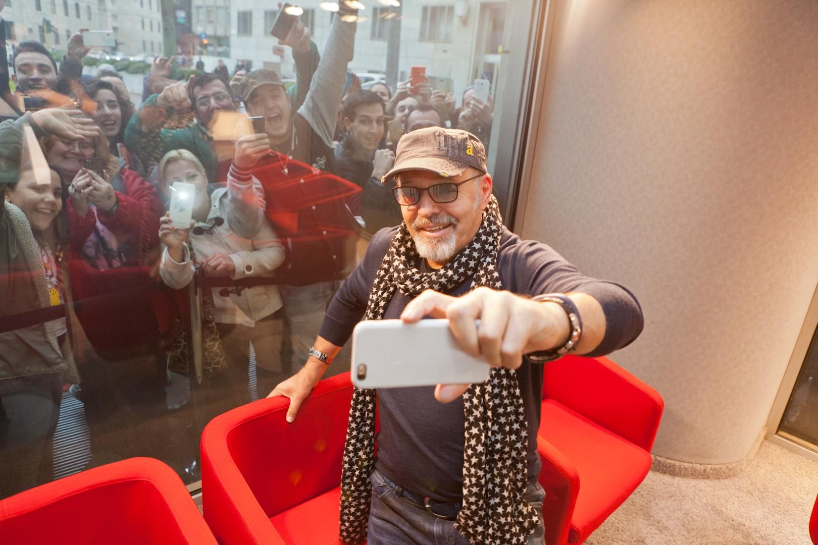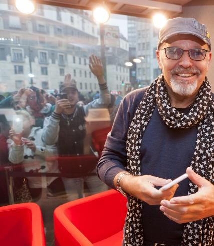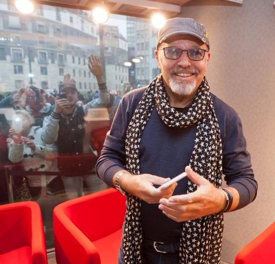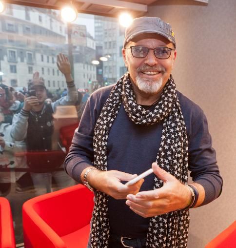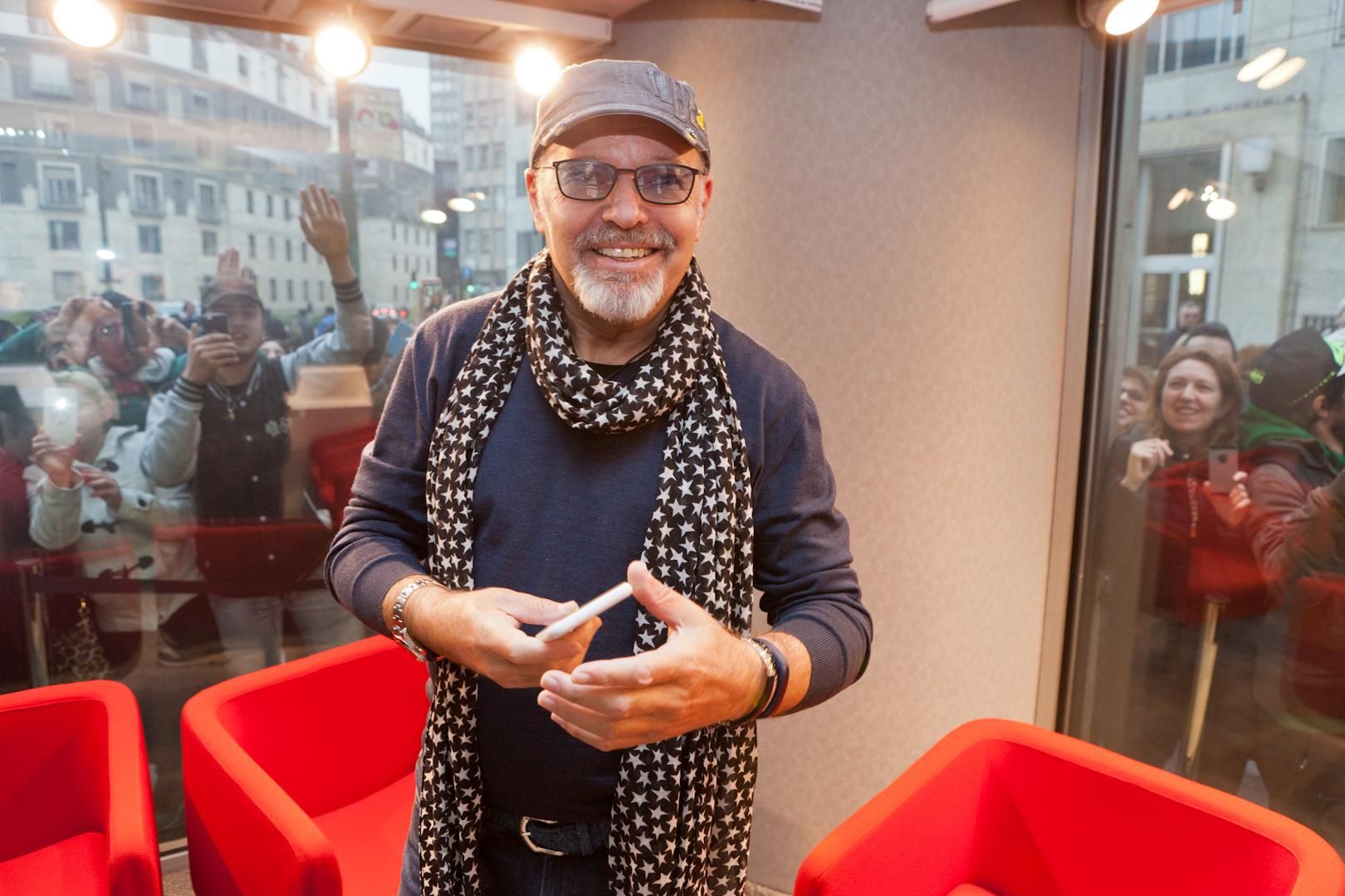 Daniele Battaglia fa buona accoglienza mentre, di fronte alla sede della radio, un nugolo di fan agita striscioni.