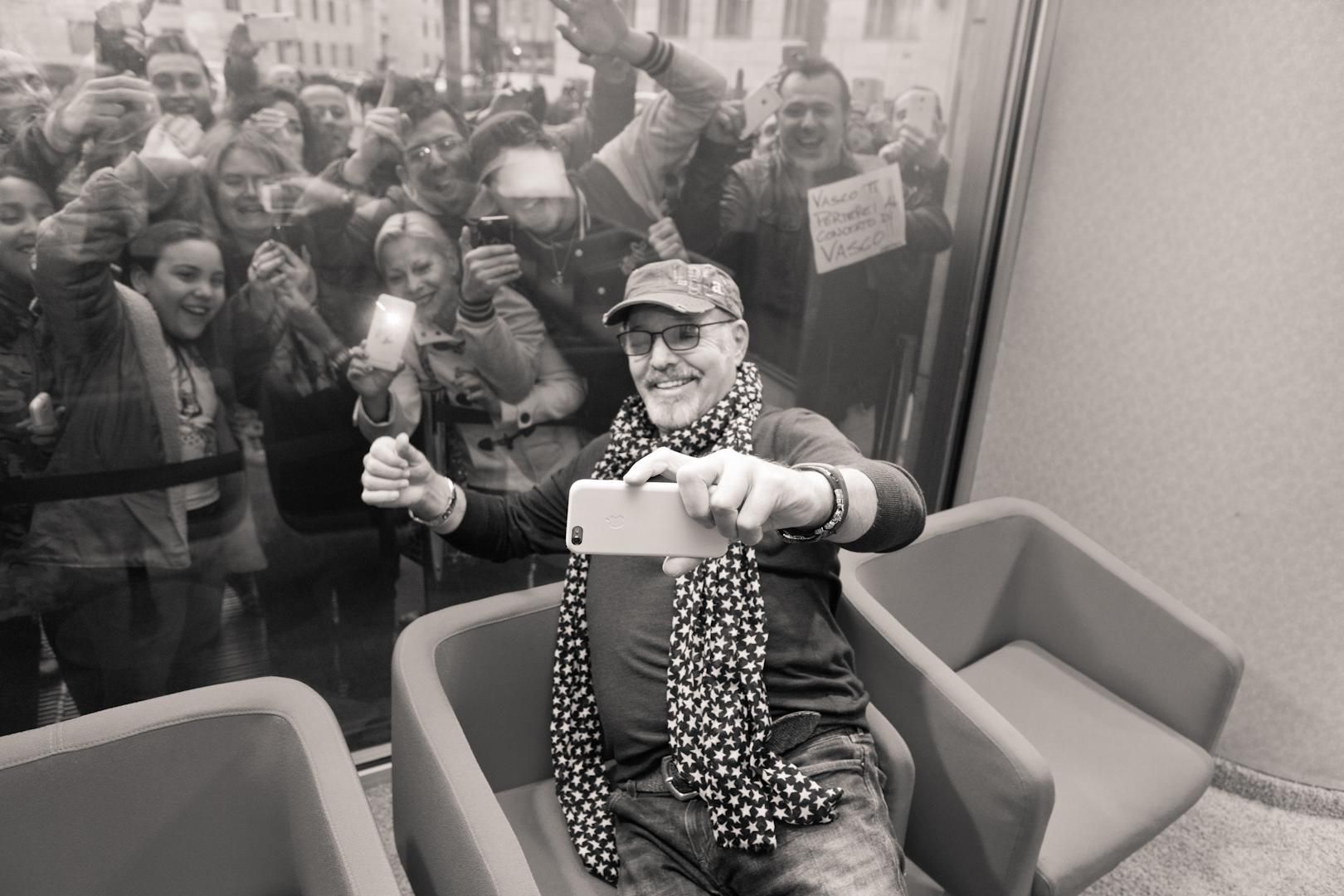 Vasco ha l’aria di essere capitato lì per caso; si lascia ammaliare dalle parole di Battaglia sulla visione del film, come se non riguardasse lui, in prima persona, come se ascoltasse il racconto di una cosa che si riferisce a un conoscente; annuisce; saluta il pubblico dalla vetrata…