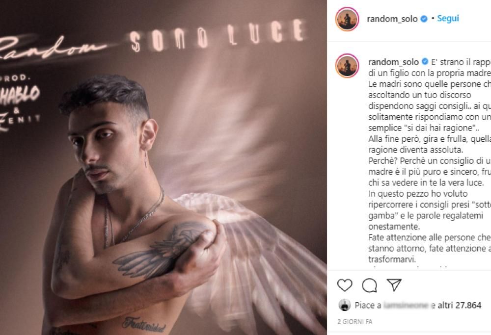 Da oggi, venerdì 11 dicembre, è disponibile il nuovo singolo inedito di Random dal titolo “Sono luce“. Quest’ultimo lavoro lanciato dal rapper conclude in bellezza un anno di successi.