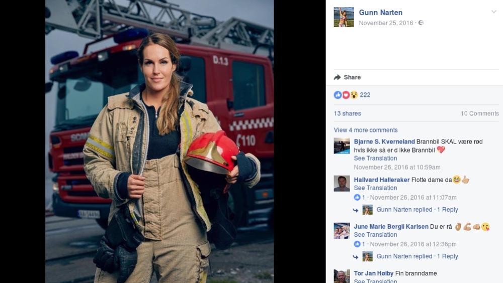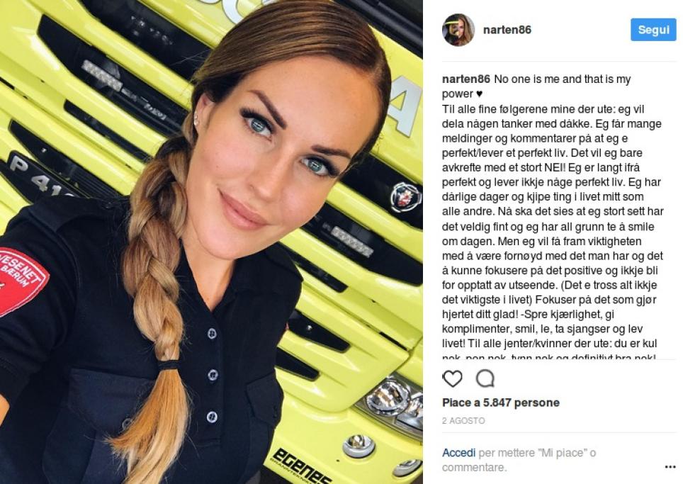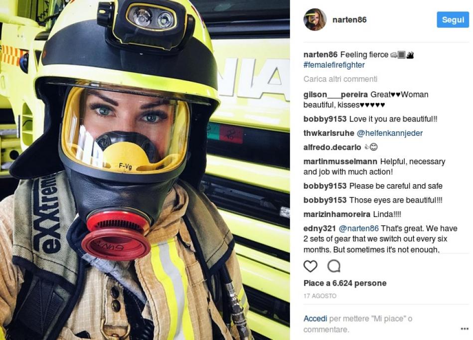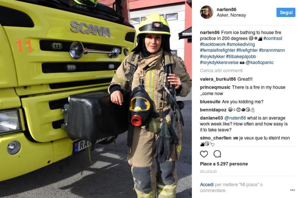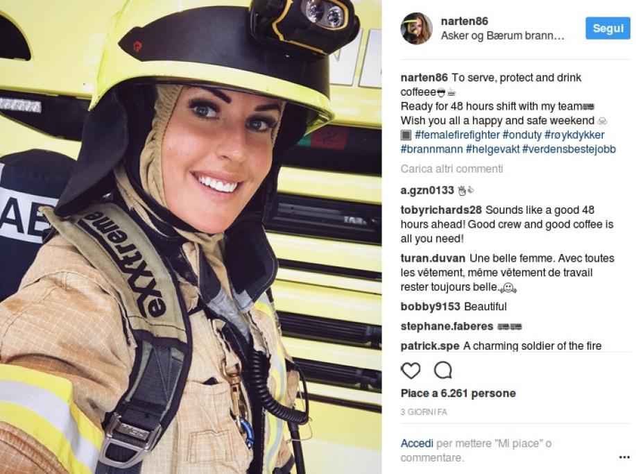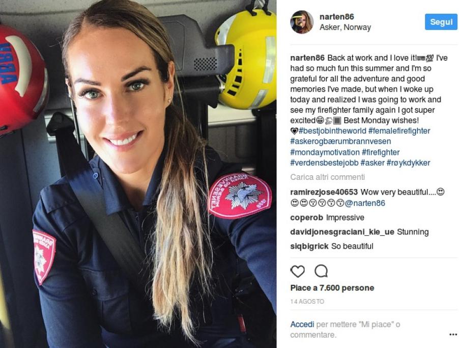 Vi presentiamo Gunn Narten, splendida 30enne norvegese che di professione fa il pompiere. La donna è molto seguita sui suoi profili social, dove può contare 125mila followers su Instagram, tutto merito del suo fisico statuario e dei suoi scatti hot, che si alternano con quelli in divisa.