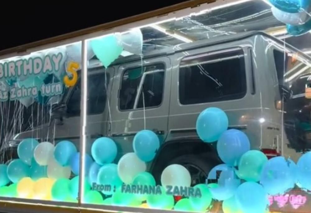 Qualche giorno dopo però Farhana pubblica un altro video in cui si vede Fatima bendata che viene guidata dai genitori verso il suo regalo di compleanno a sorpresa. Una volta tolta la benda e aperti gli occhi la macchina è proprio lì davanti a lei, con tanto di pacchetto. Infatti, a sorprendere la bambina è la G Wagon tanto desiderata, di un colore verdastro e avvolta in una confezione regalo trasparente. Nel video, della durata di 21 secondi, i genitori hanno spiegato al pubblico il motivo che li ha spinti a fare un simile regalo che, come detto in precedenza, sarebbe quello di motivarla ad andare a scuola e realizzare il suo sogno di diventare medico.