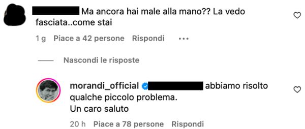 Sono stati in tantissimi a commentare chiedendo informazioni riguardo la salute del cantante: “Ciao Gianni come stai cosa è successo alla tua mano come mai ancora fasciata?”, o ancora, “Perché la mano è nuovamente fasciata?”, oppure, “Hai ancora la mano fasciata Gianni mi dispiace“, e poi, “Gianni ma la mano? Come sta?”.