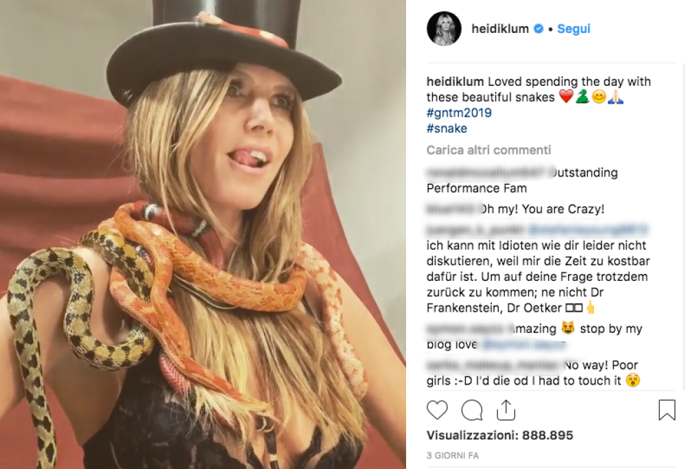 Nel video che la stessa modella ha postato sul suo profilo si vedono i serpenti che le strisciano lungo il corpo e, sebbene la scena faccia venire i brividi, per lei sembrava tutto normale: Heidi, infatti, appare tranquilla e perfettamente a suo agio e sorridente, anche in quella situazione un po’ “estrema”. “Mi è piaciuto molto trascorrere la giornata insieme a questi splendidi serpenti”, ha commentato la modella accanto al video. Chissà, forse con questa iniziativa ha voluto lanciare un messaggio alle aspiranti modelle della prossima edizione del talent tedesco: per diventare una vera top model bisogna essere disposte a tutto!