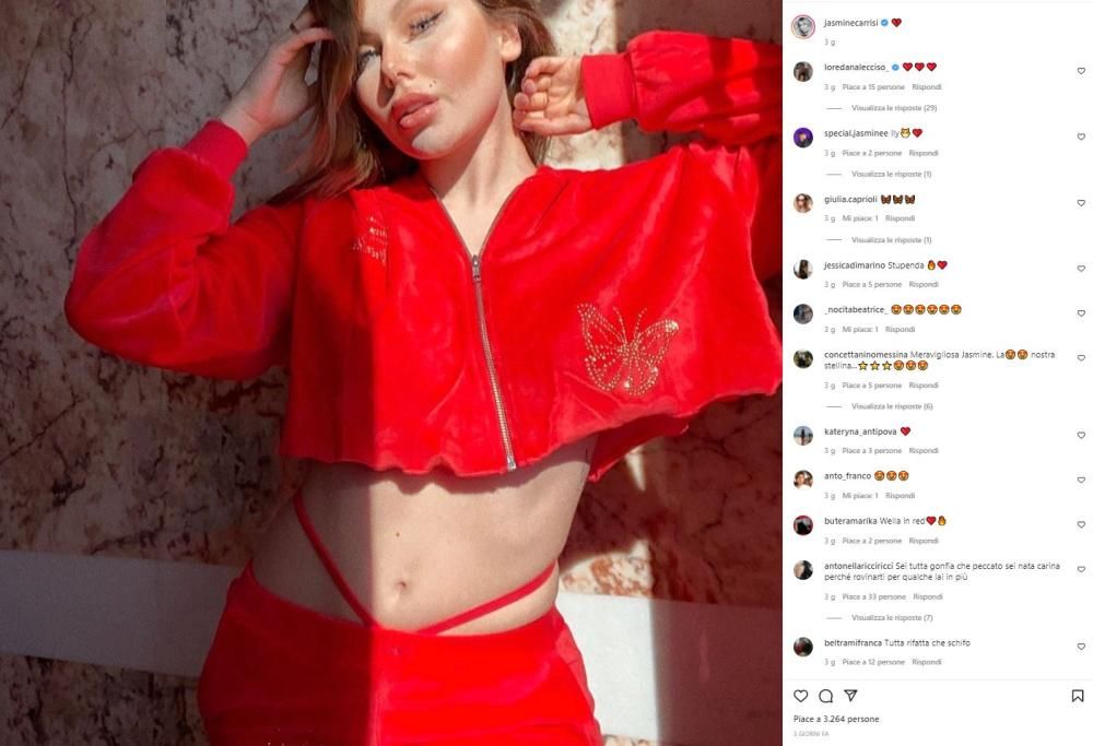 È bastato uno scatto pubblicato su Instagram per scatenare la polemica. Tutti si chiedono che cosi sia successo alla piccola Jasmine Carrisi, figlia di Albano e Loredana Lecciso, classe 2001. L’ultimo scatto pubblicato dalla ventunenne mostra indubbiamente dei tratti somatici molto più adulti, come se dietro ci fosse lo zampino del bisturi. Zigomi alti, visto insolitamente gonfio e labbra a canotto mentre posa con indosso una sexy tutina rossa. Gli attacchi dei follower non tardano ad arrivare; in tanti si chiedono che cosa abbia combinato e se ce ne sia stato davvero bisogno: “Piccola, fatti aiutare. C’è qualche problema. Sei bellissima non hai bisogno di ritocchi”, scrive preoccupato qualcuno; altri la accusano di essere “di plastica”. Un utente però suggerisce che potrebbe trattarsi anche solo di filtri Instagram che in effetti oggi possono fare tutto, anche aggiungere 10 anni a una ragazza di 20. Lei per ora non commenta, aspettiamo i prossimi scatti o di vederla nuovamente in TV per verificare se sia rimasta la bella ragazza che era. La giovanissima ha già debuttato come attrice a 17 anni interpretando Isabella d’Aragone nel film “La dama e l’ermellino”, ma la sua passione è la musica: nel 2020 ha pubblicato il suo primo singolo e la scorsa estate è uscita con la canzone “Calamite – un tuffo nel cuore”.Vediamo dove troverà spazio per dimostrare il suo talento, aldilà di eventuali ritocchi.