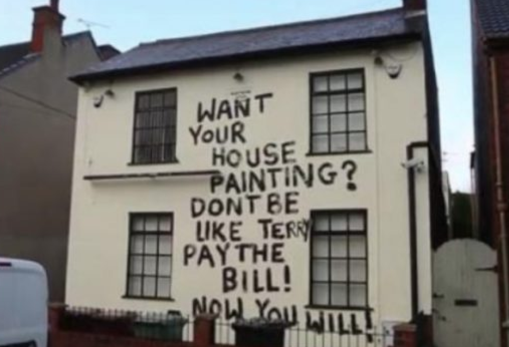 Il conto ammonta a 1150 sterline ma Taylor ne avrebbe finora versate a Reeves solo 650, ecco perché l’imbianchino ha più volte chiesto al cliente di provvedere al pagamento della somma restante. Questi soldi, però, non sono mai arrivati e così lui ha deciso di vendicarsi: “Vuoi avere la tua casa ritinteggiata? Non fare come Terry, paga tutto il conto! Ora lo farai!”. Questa è la frase che l’imbianchino ha scritto con la vernice nera sulla facciata del pub di Taylor appena ritinteggiata.