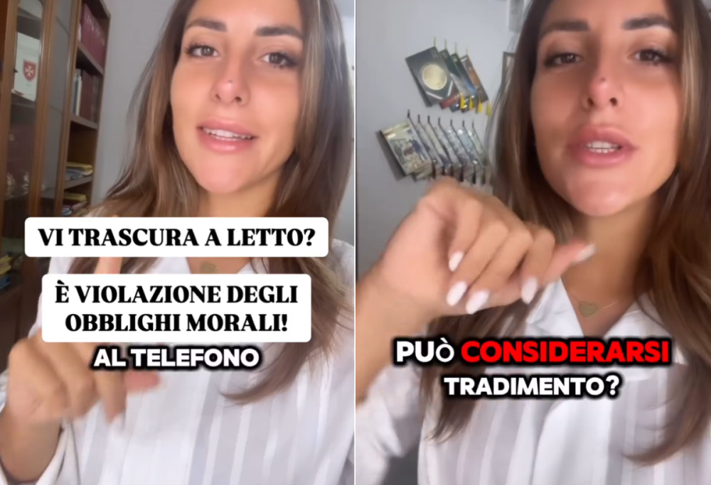 “Il partner è al telefono h24 anche mentre siete a letto. Può considerarsi tradimento?”, domanda all’inizio del video. E risponde: “È sicuramente una violazione degli obblighi di assistenza morale perché in quel momento, soprattutto se la condotta è reiterata nel tempo, sta trascurando il rapporto coniugale”. “Dunque” – conclude – “se vi state chiedendo ‘può essere domandato l’addebito anche nel caso in cui lui è sempre al telefono ed evita contatti intimi?’. La risposta è sì”.