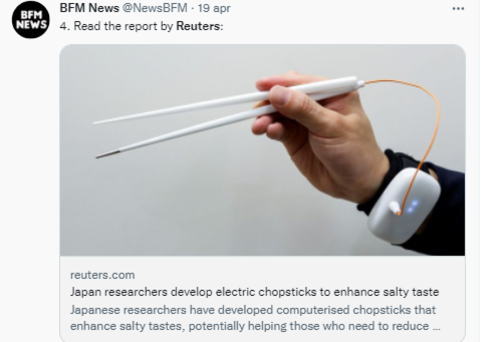 Una collaborazione tra il professore della Meiji University, Homei Miyashita e il produttore di bevande Kirin Holdings Co., ha dato origine alle prime bacchette elettriche per esaltare i sapori. La necessità è nata per contrastare il problema del consumo troppo elevato di sale in Giappone. Qui la dieta tradizionale prevede una grande abbondanza di sale, nemico dell’ipertensione e dei problemi cardiovascolari. L’adulto giapponese consuma 10g di sale al giorno, mentre le raccomandazioni dell’OMS parlano di un consumo ideale di massimo 5 g al giorno. Di recente il Ministero della Salute giapponese ha ideato una campagna che invita la popolazione a ridurre il consumo giornaliero di sale ad un massimo di 7,5 grammi per gli uomini e 6,5 grammi per le donne.