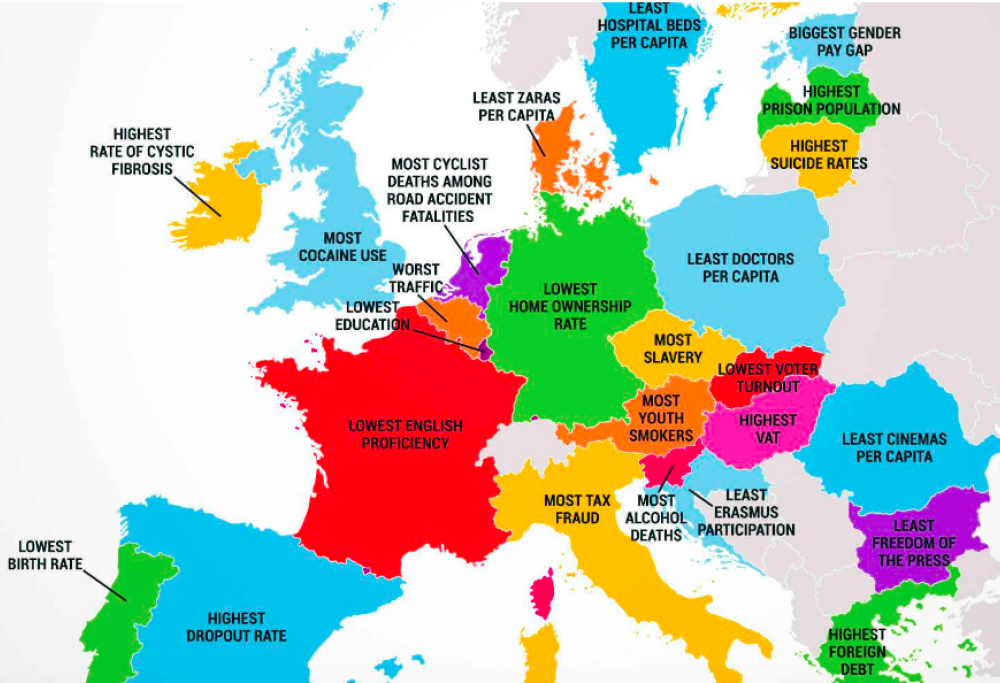 Non stiamo parlando di turisti ubriachi o atti di bullismo, ma di una mappa che racconta alcuni dei problemi che affliggono 28 Paesi europei, da quelli con meno cinema pro-capite a quelli con più tasse (che Paese sarà secondo voi?).