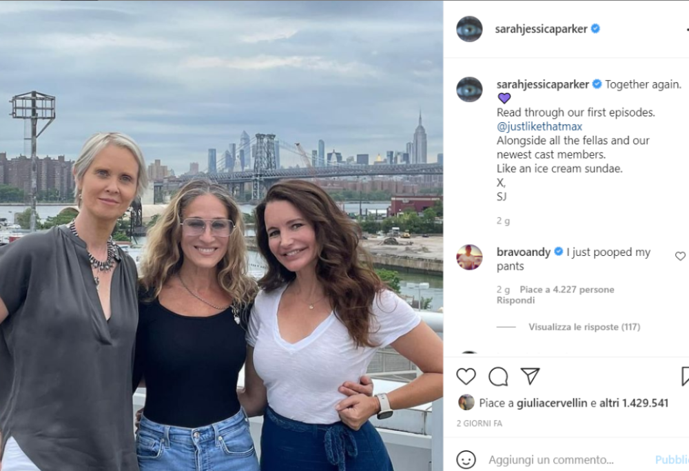 Sarah Jessica Parker, la Carrie Bradshaw di Sex & the city ha pubblicato uno scatto direttamente dal set del remake della serie. La foto con “le ragazze”, cioè con Cynthia Nixon, Miranda nella serie, e Kristin Davis, che interpreta Charlotte è stata accolta da una lunga serie di commenti al vetriolo. Il motivo delle critiche? L’abuso di chirurgia estetica da parte di Kristin Davis a cui in effetti lo scatto non rende giustizia. “È irriconoscibile” dice qualcuno. “Cosa è successo alla sua faccia?” chiede preoccupato un utente, ma la risposta pronta arriva da un commento laconico: “Filler, ora ha la faccia come un cuscino”.