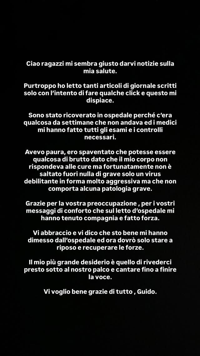 Per calmare gli animi dei suoi follower, l’artista romano ha deciso di rompere il silenzio con una Instagram story, spiegando cosa gli è successo. “Sono stato ricoverato in ospedale perché c’era qualcosa da settimane che non andava ed i medici mi hanno fatto tutti gli esami e i controlli necessari”. Il cantante, il cui vero nome è Guido Luigi Senia, ha raccontato senza filtri le sue paure: Ero spaventato che potesse essere qualcosa di brutto dato che il mio corpo non rispondeva alle cure ma fortunatamente non è saltato fuori nulla di grave, solo un virus debilitante in forma molto aggressiva ma che non comporta alcuna patologia grave”.
