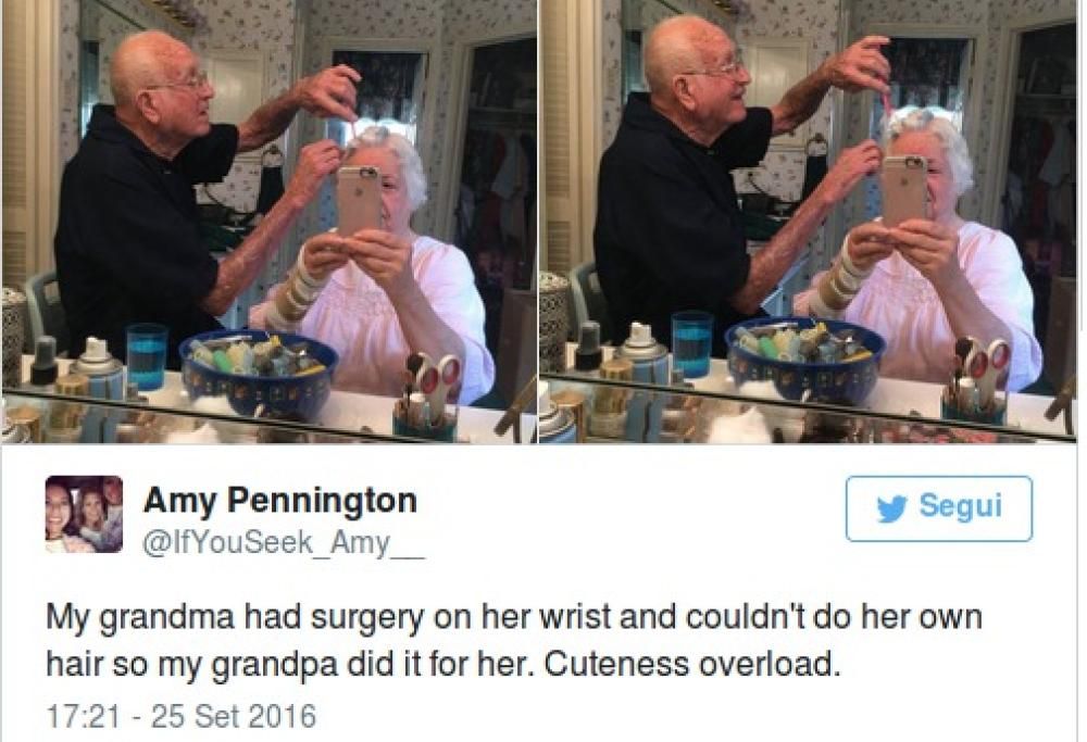 È il caso della foto condivisa su Twitter da Amy Pennington, nipote di questa bella coppia di sposi, non proprio più giovanissimi, ma che da come si prendono cura l’uno dell’altra emerge chiaramente che ad essere passati sono solo gli anni e non l’amore che nutrono l’uno per l’altra.