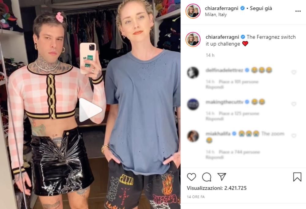 La popolare influencer e il rapper hanno postato sui rispettivi profili social la clip in cui si scambiano i vestiti. Nella prima parte del video la Ferragni appare in corpetto di Chanel e minigonna in latex nera, mentre il marito Fedez indossa una t-shirt azzurra di cotone e dei bermuda blu. Ma solo pochi secondi dopo la scena si inverte ed è Fedez questa volta a mostrarsi in minigonna e corpetto.