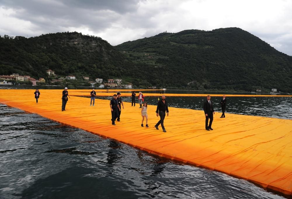 L’ambiziosa opera dell’artista bulgaro Christo sul lago d’Iseo denominata “The Floating Piers” ha aperto i battenti oggi tra qualche boicottaggio e l’entusiasmo dei turisti accorsi per passeggiare da Sulzano a Monte Isola a piedi, direttamente sull’acqua.