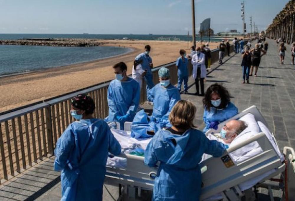Infermieri portano sul Lungomare di Barcellona il paziente guarito dal Covid
