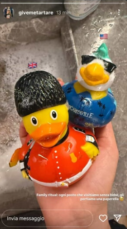 A spiazzare i commentatori è arrivato un dettaglio apparentemente marginale. Jacqueline ha condiviso su Instagram l’immagine di due paperelle, una con la bandiera americana e una con quella britannica, aggiungendo: “Family ritual: ogni posto che visitiamo senza bebè, gli portiamo una paperella”.