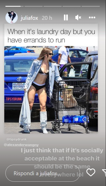 Julia Fox, attrice italiana naturalizzata statunitense, sta facendo parlare di sé in questi giorni per una provocazione “intima”. Si è presentata a fare la spesa al supermercato in mutande e reggiseno. Sopra l’intimo solo un lungo giacchetto di jeans e un paio di stivali anche quelli di jeans. La cosa incredibile è che pure indossando solo intimo, l’attrice aveva addosso una cifra da capogiro mentre andava in un alimentari di Hollywood: un reggiseno di cotone nero e biancheria intima abbinati a un blazer di jeans, stivali al ginocchio (950$) e borsa morbida (835$),entrambi del suo designer preferito Alexander Wang. Le foto sono apparse prima sul Daily Mail e a catena sugli altri giornali e sul web. Ma la sua risposta è ancora più provocatoria. “Io penso che se questo look è socialmente accettato in spiaggia, dovrebbe esserlo ovunque”, riflessione interessante, in effetti. Nel frattempo si sprecano i meme; il più divertente? Quello che recita: “Quando è il giorno del bucato ma hai delle commissioni da sbrigare”, meme che lei stessa ha ironicamente condiviso nelle sue storie Instagram.