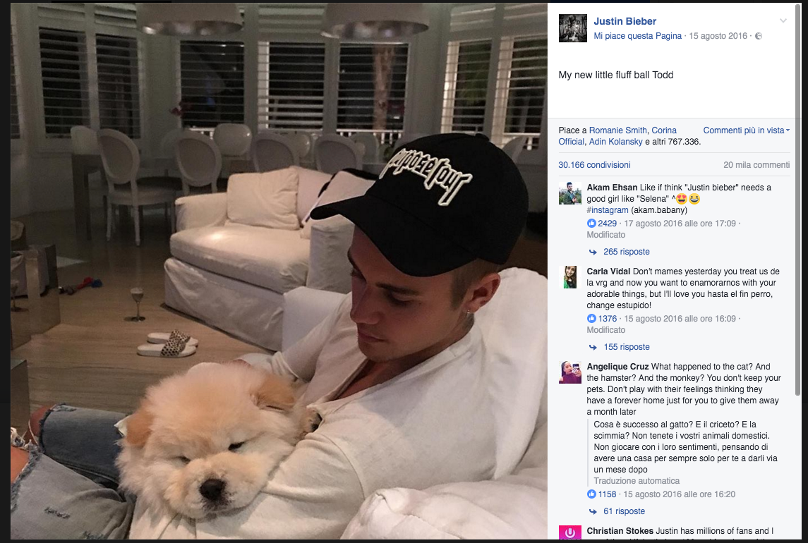 Justin Bieber ha abbandonato il suo cucciolo Todd, un chow chow di sette mesi. A prendersene cura è stato uno dei ballerini del suo show, CJ Salvador, che ha purtroppo scoperto anche come l’animale fosse gravemente malato e avesse bisogno di un’operazione chirurgica del costo di ottomila dollari.