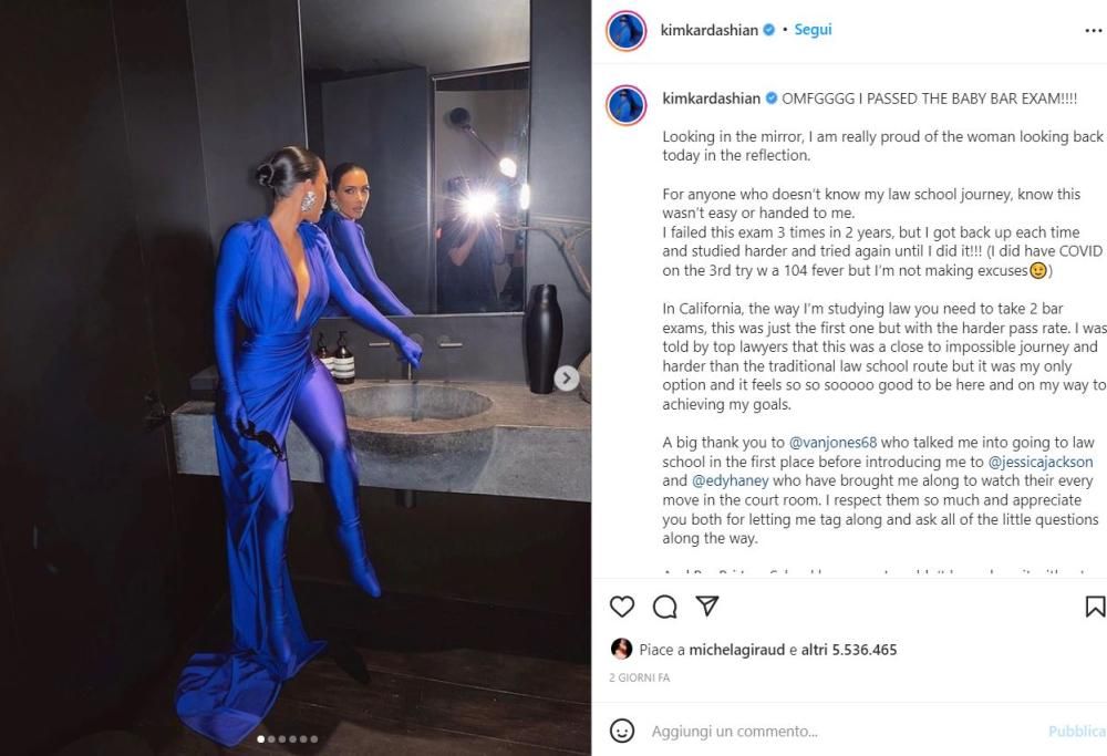 Kim Kardashian sta dando una significativa svolta alla sua vita e alla sua carriera. La famosa imprenditrice ha annunciato qualche giorno fa su Instagram di aver superato il suo primo esame per intraprendere la carriera di avvocato. Non è stato facile, come racconta lei stessa: “Ho fallito questo esame 3 volte in due anni, ma mi sono fatta forza e ho studiato meglio per provare ancora fino a che non ce l’ho fatta”. L’esame è diviso in due parti, ma Kardashian ha rassicurato i fan sul fatto che la prima fosse la parte più impegnativa da superare. Nel frattempo ha avviato la causa per divorziare dal marito Kanye West e abbandonare il suo cognome, acquisito sette anni fa. Nel frattempo lui lancia messaggi contrastanti, le invia dediche d’amore, anche pubblicamente, ma nel frattempo convive a Malibù con la nuova fiamma, la giovane influencer e modella Vinetria. Durante un concerto di beneficenza del 9 dicembre, Kanye West avrebbe cambiato le parole del finale della sua canzone Runaway per chiedere all’ex moglie di tornare insieme: “Baby, ho bisogno che tu corri indietro da me… più specificamente, Kimberly”. In tutta risposta, la Kardashian il giorno dopo si è rivolta a un giudice per farsi dichiarare ufficialmente single e per abbandonare il cognome da sposata. D’altronde la ragazzo ora è felice con l’attore Pete Davidson e vuole concentrarsi sul suo nuovo sogno di diventare avvocato.