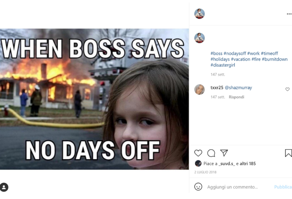 Uno sguardo furbetto da bambina dispettosa, mentre dietro divampano le fiamme: è il meme di disaster girl, uno dei più diffusi e tragicamente ironici di sempre. Come spesso accade con queste buffe immagini, anche questo è nata per caso. La bimba immortalata è Zoe Roth e l’anno dello scatto è il 2005; il padre della bambina aveva appena comprato una fotocamera nuova, fiammante, e decide di inaugurarla andando a fare qualche scatto nella vicina stazione dei pompieri dove è in corso un’esercitazione su un incendio controllato. Tiriamo tutti un sospiro di sollievo, la bimba non sta sorridendo sadicamente di fronte a una tragedia in corso, ma è solo in posa per il papà mentre dietro è in corso c’è un’esercitazione di routine. Intanto il padre di avere un buon scatto tra le mani e lo invia a vari concorsi, vincendone un paio e creando così il mito di Disaster Girl.